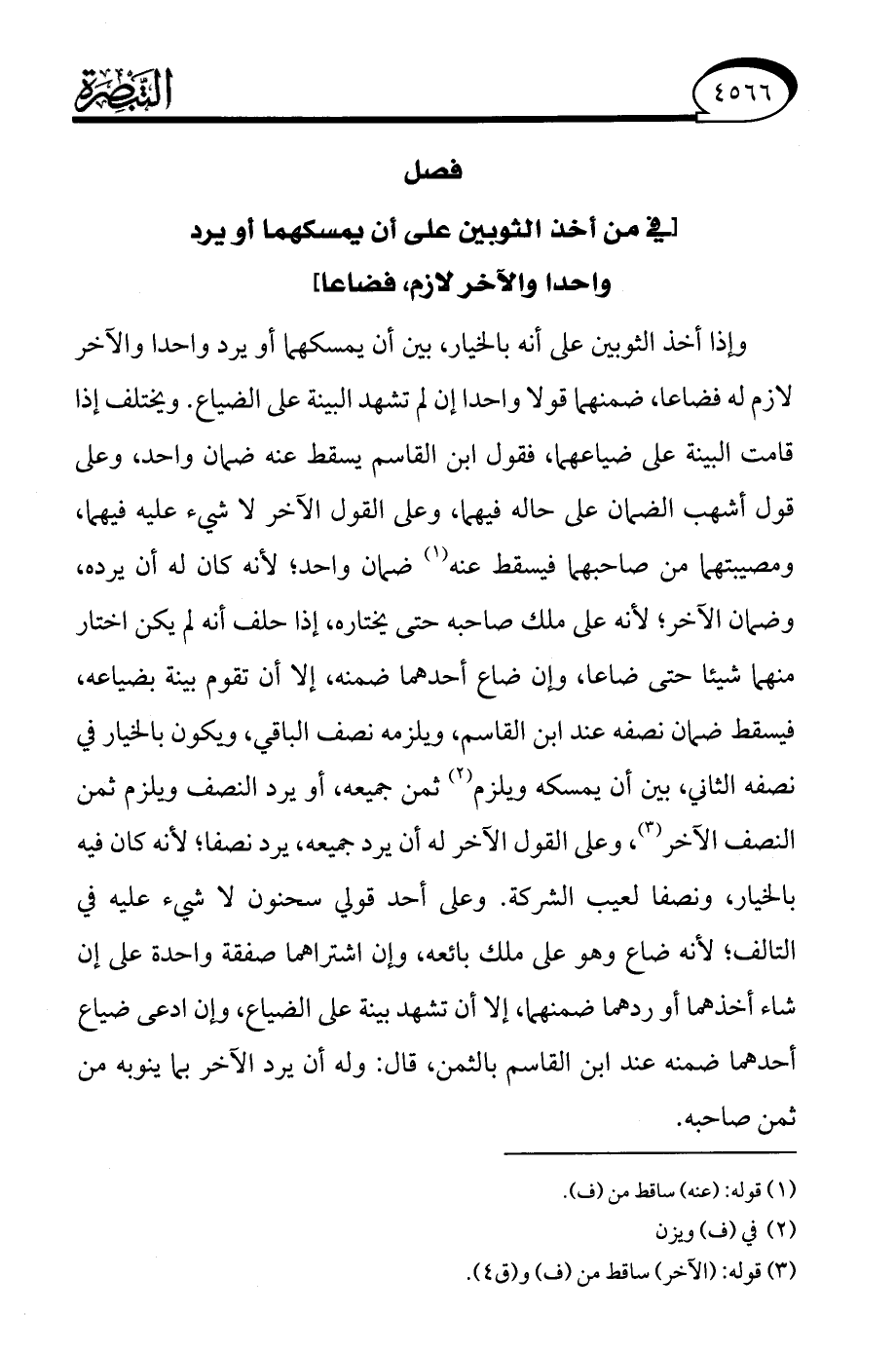 وإذا أخذ الثوبين على أنه بالخيار، بين أن يمسكهما أو يرد واحدا والآخر لازم له فضاعا، ضمنهما قولا واحدا إن لم تشهد البينة على الضياع. ويختلف إذا قامت البينة على ضياعهما، فقول ابن القاسم يسقط عنه ضمان واحد، وعلى قول أشهب الضمان على حاله فيهما، وعلى القول الآخر لا شيء عليه فيهما، ومصيبتهما من صاحبهما فيسقط عنه (¬1) ضمان واحد؛ لأنه كان له أن يرده، وضمان الآخر؛ لأنه على ملك صاحبه حتى يختاره، إذا حلف أنه لم يكن اختار منهما شيئًا حتى ضاعا، وإن ضاع أحدهما ضمنه، إلا أن تقوم بينة بضياعه، فيسقط ضمان نصفه عند ابن القاسم، ويلزمه نصف الباقي، ويكون بالخيار في نصفه الثاني، بين أن يمسكه ويلزم (¬2) ثمن جميعه، أو يرد النصف ويلزم ثمن النصف الآخر (¬3)، وعلى القول الآخر له أن يرد جميعه، يرد نصفا؛ لأنه كان فيه بالخيار، ونصفا لعيب الشركة. وعلى أحد قولي سحنون لا شيء عليه في التالف؛ لأنه ضاع وهو على ملك بائعه، وإن اشتراهما صفقة واحدة على إن شاء أخذهما أو ردهما ضمنهما، إلا أن تشهد بينة على الضياع، وإن ادعى ضياع أحدهما ضمنه عند ابن القاسم بالثمن، قال: وله أن يرد الآخر بما ينوبه من ثمن صاحبه.