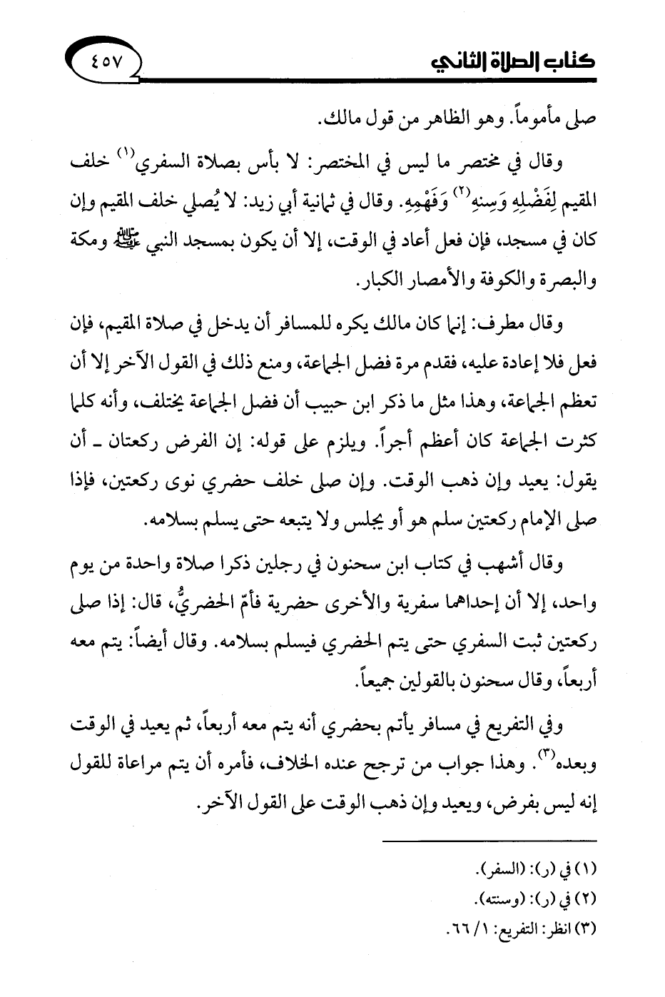 وقال في مختصر ما ليس في المختصر: لا بأس بصلاة السفري (¬1) خلف المقيم لِفَضْلِهِ وَسِنهِ (¬2) وَفَهْمِهِ. وقال في ثمانية أبي زيد: لا يُصلي خلف المقيم وإن كان في مسجد، فإن فعل أعاد في الوقت، إلا أن يكون بمسجد النبي - صلى الله عليه وسلم - ومكة والبصرة والكوفة والأمصار الكبار.