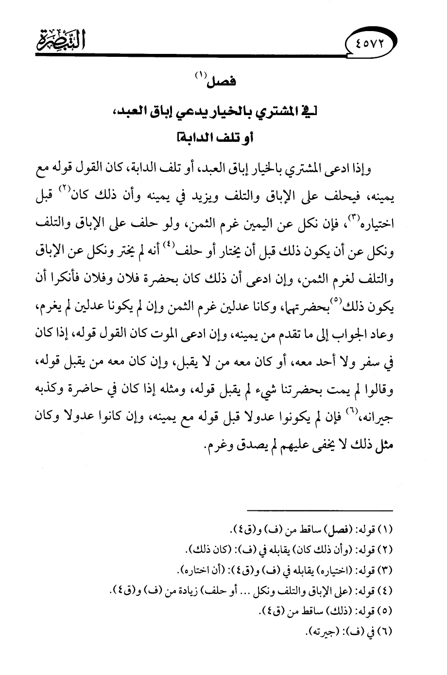 وإذا ادعى المشتري بالخيار إباق العبد، أو تلف الدابة، كان القول قوله مع يمينه، فيحلف على الإباق والتلف ويزيد في يمينه وأن ذلك كان (¬2) قبل اختياره (¬3)، فإن نكل عن اليمين غرم الثمن، ولو حلف على الإباق والتلف ونكل عن أن يكون ذلك قبل أن يختار أو حلف (¬4) أنه لم يختر ونكل عن الإباق والتلف لغرم الثمن، وإن ادعى أن ذلك كان بحضرة فلان وفلان فأنكرا أن يكون ذلك (¬5) بحضرتهما، وكانا عدلين غرم الثمن وإن لم يكونا عدلين لم يغرم، وعاد الجواب إلى ما تقدم من يمينه، وإن ادعى الموت كان القول قوله، إذا كان في سفر ولا أحد معه، أو كان معه من لا يقبل، وإن كان معه من يقبل قوله، وقالوا لم يمت بحضرتنا شيء لم يقبل قوله، ومثله إذا كان في حاضرة وكذبه جيرانه، (¬6) فإن لم يكونوا عدولا قبل قوله مع يمينه، وإن كانوا عدولا وكان مثل ذلك لا يخفى عليهم لم يصدق وغرم.