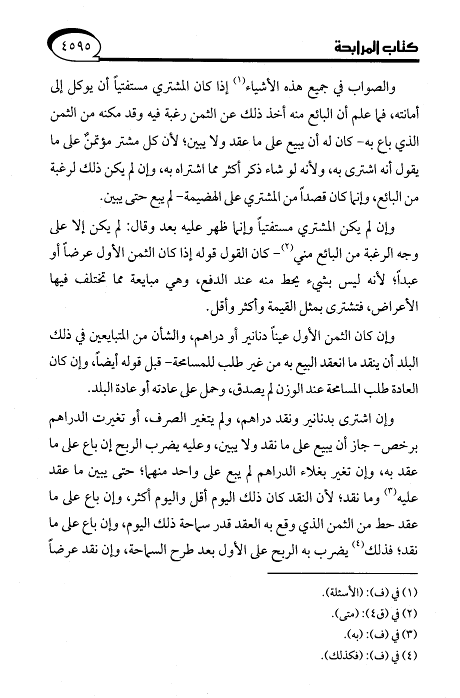 وإن اشترى بدنانير ونقد دراهم، ولم يتغير الصرف، أو تغيرت الدراهم برخص- جاز أن يبيع على ما نقد ولا يبيّن، وعليه يضرب الربح إن باع على ما عقد به، وإن تغير بغلاء الدراهم لم يبع على واحد منهما، حتى يبيّن ما عقد عليه (¬3) وما نقد؛ لأن النقد كان ذلك اليوم أقل واليوم أكثر، وإن باع على ما عقد حط من الثمن الذي وقع به العقد قدر سماحة ذلك اليوم، وإن باع على ما نقد؛ فذلك (¬4) يضرب به الربح على الأول بعد طرح السماحة، وإن نقد عرضًا