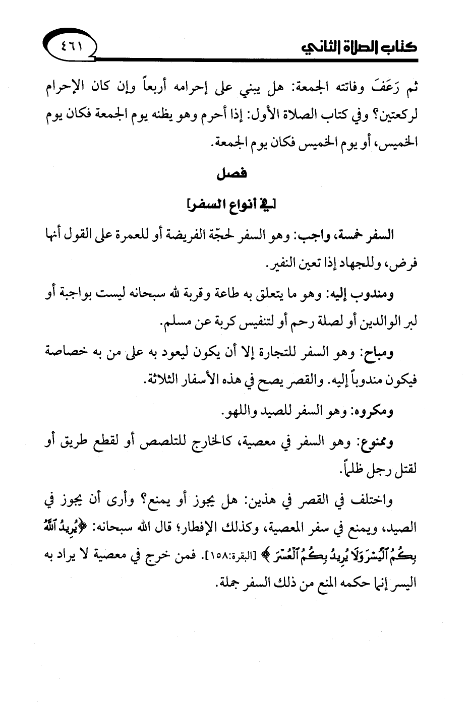 السفر خمسة، واجب: وهو السفر لحجّة الفريضة أو للعمرة على القول أنها فرض، وللجهاد إذا تعين النفير.
