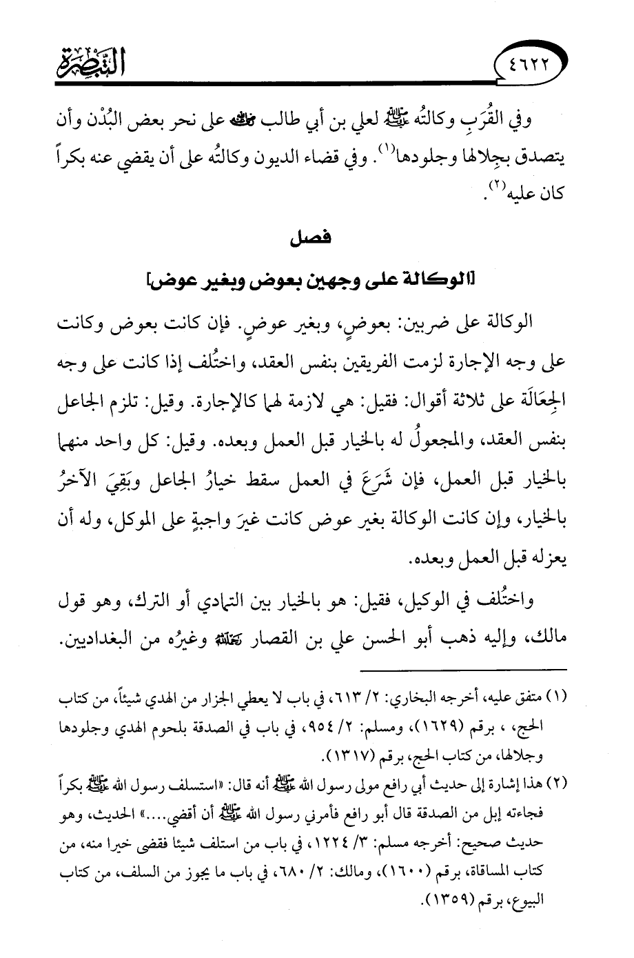 وفي القُرَبِ وكالتُه - صلى الله عليه وسلم - لعلي بن أبي طالب - رضي الله عنه - على نحر بعض البُدْن وأن يتصدق بجِلالها وجلودها (¬1). وفي قضاء الديون وكالتُه على أن يقضي عنه بكرًا كان عليه (¬2).