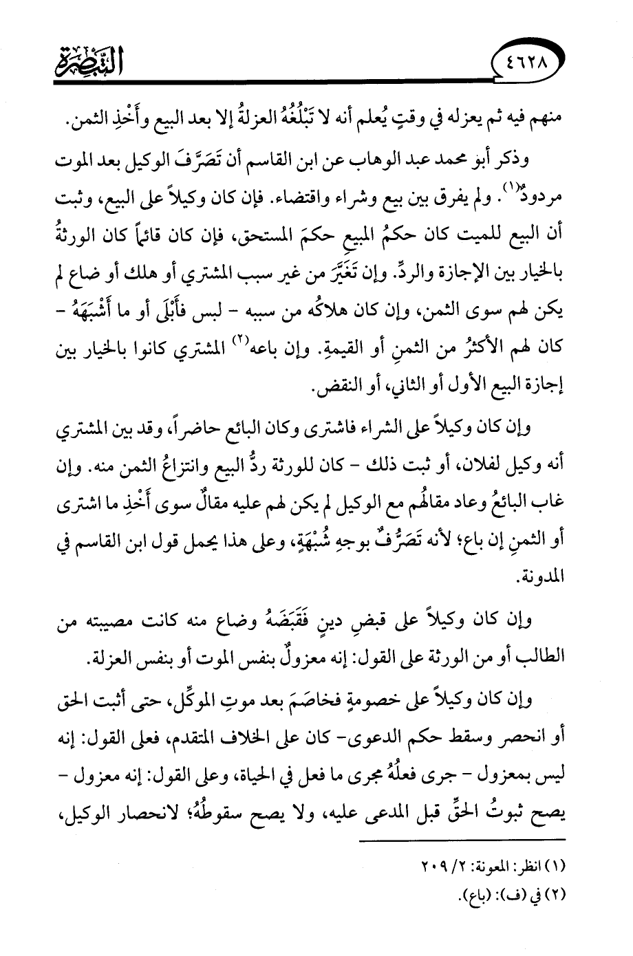 وإن كان وكيلًا على الشراء فاشترى وكان البائع حاضرًا، وقد بين المشتري أنه وكيل لفلان، أو ثبت ذلك- كان للورثة ردُّ البيع وانتزاعُ الثمن منه. وإن غاب البائعُ وعاد مقالهُم مع الوكيل لم يكن لهم عليه مقالٌ سوى أَخْذِ ما اشترى أو الثمنِ إن باع؛ لأنه تَصَرُّفٌ بوجهِ شُبْهَةٍ، وعلى هذا يحمل قول ابن القاسم في المدونة.