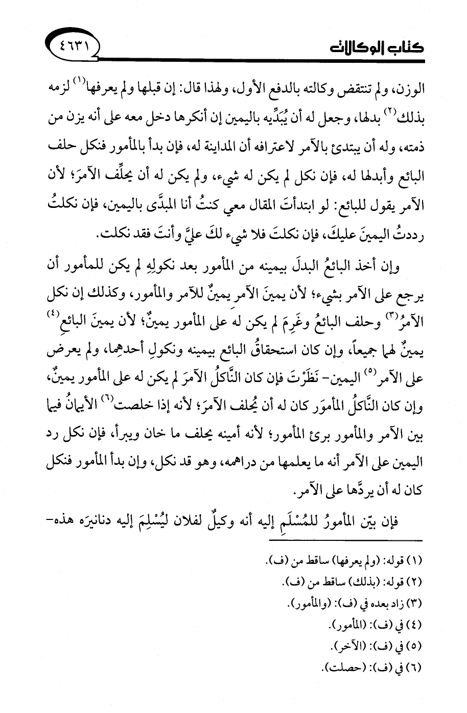 الوزن، ولم تنتقض وكالته بالدفع الأول، ولهذا قال: إن قبلها ولم يعرفها (¬1) لزمه بذلك (¬2) بدلها، وجعل له أن يُبَدِّيه باليمين إن أنكرها دخل معه على أنه يزن من ذمته، وله أن يبتدئ بالآمر لاعترافه أن المداينة له، فإن بدأ بالمأمور فنكل حلف البائع وأبدلها له، فإن نكل لم يكن له شيء، ولم يكن له أن يحلِّف الآمرَ؛ لأن الآمر يقول للبائع: لو ابتدأتَ المقال معي كنتُ أنا المبدَّى باليمين، فإن نكلتُ رددتُ اليمينَ عليكَ، فإن نكلتَ فلا شيء لكَ عليَّ وأنتَ فقد نكلت.