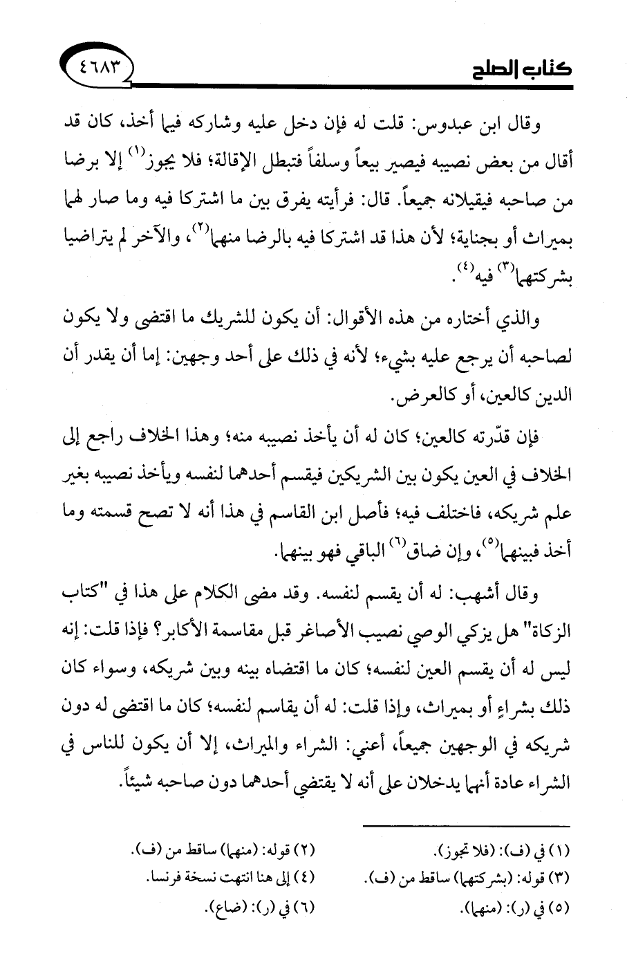 وقال ابن عبدوس: قلت له فإن دخل عليه وشاركه فيما أخذ، كان قد أقال من بعض نصيبه فيصير بيعًا وسلفًا فتبطل الإقالة؛ فلا يجوز (¬1) إلا برضا من صاحبه فيقيلانه جميعًا. قال: فرأيته يفرق بين ما اشتركا فيه وما صار لهما بميراث أو بجناية؛ لأن هذا قد اشتركا فيه بالرضا منهما (¬2)، والآخر لم يتراضيا بشركتهما (¬3) فيه (¬4).