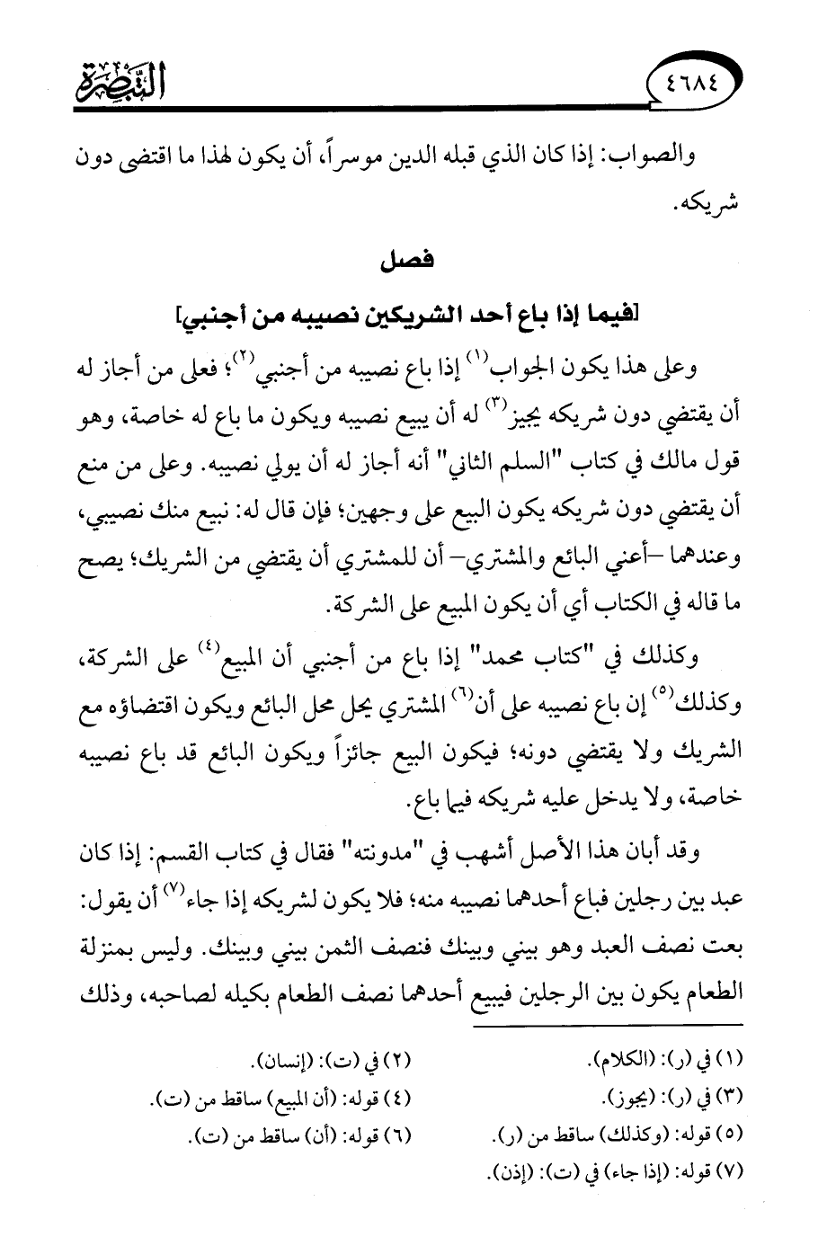 وقد أبان هذا الأصل أشهب في "مدونته" فقال في كتاب القسم: إذا كان عبد بين رجلين فباع أحدهما نصيبه منه، فلا يكون لشريكه إذا جاء (¬7) أن يقول: بعت نصف العبد وهو بيني وبينك فنصف الثمن بيني وبينك. وليس بمنزلة الطعام يكون بين الرجلين فيبيع أحدهما نصف الطعام بكيله لصاحبه، وذلك