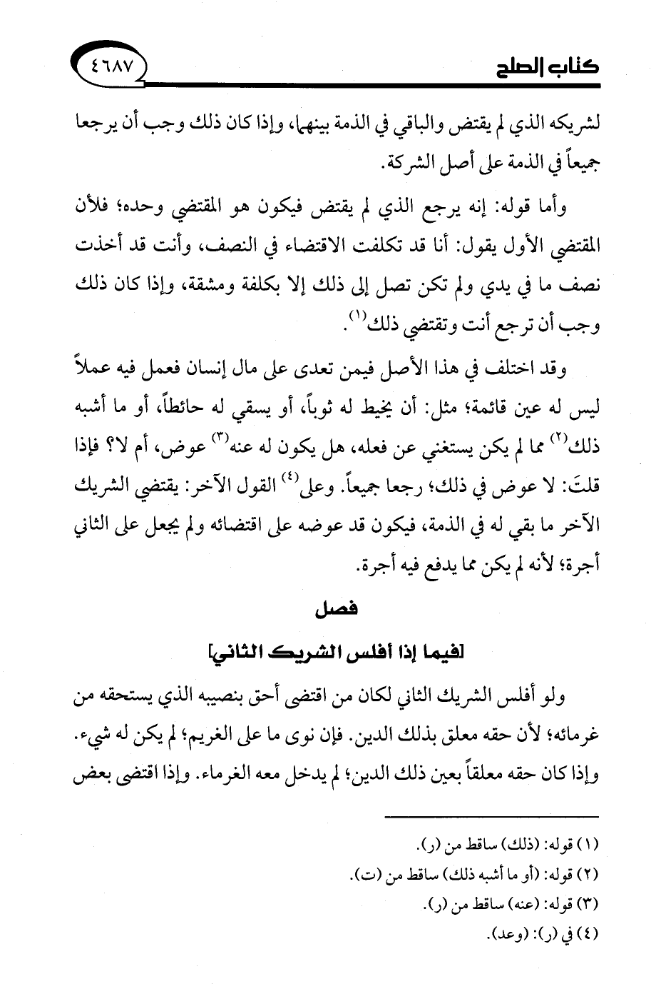 وأما قوله: إنه يرجع الذي لم يقتض فيكون هو المقتضي وحده، فلأن المقتضي الأول يقول: أنا قد تكلفت الاقتضاء في النصف، وأنت قد أخذت نصف ما في يدي ولم تكن تصل إلى ذلك إلا بكلفة ومشقة، وإذا كان ذلك وجب أن ترجع أنت وتقتضي ذلك (¬1).