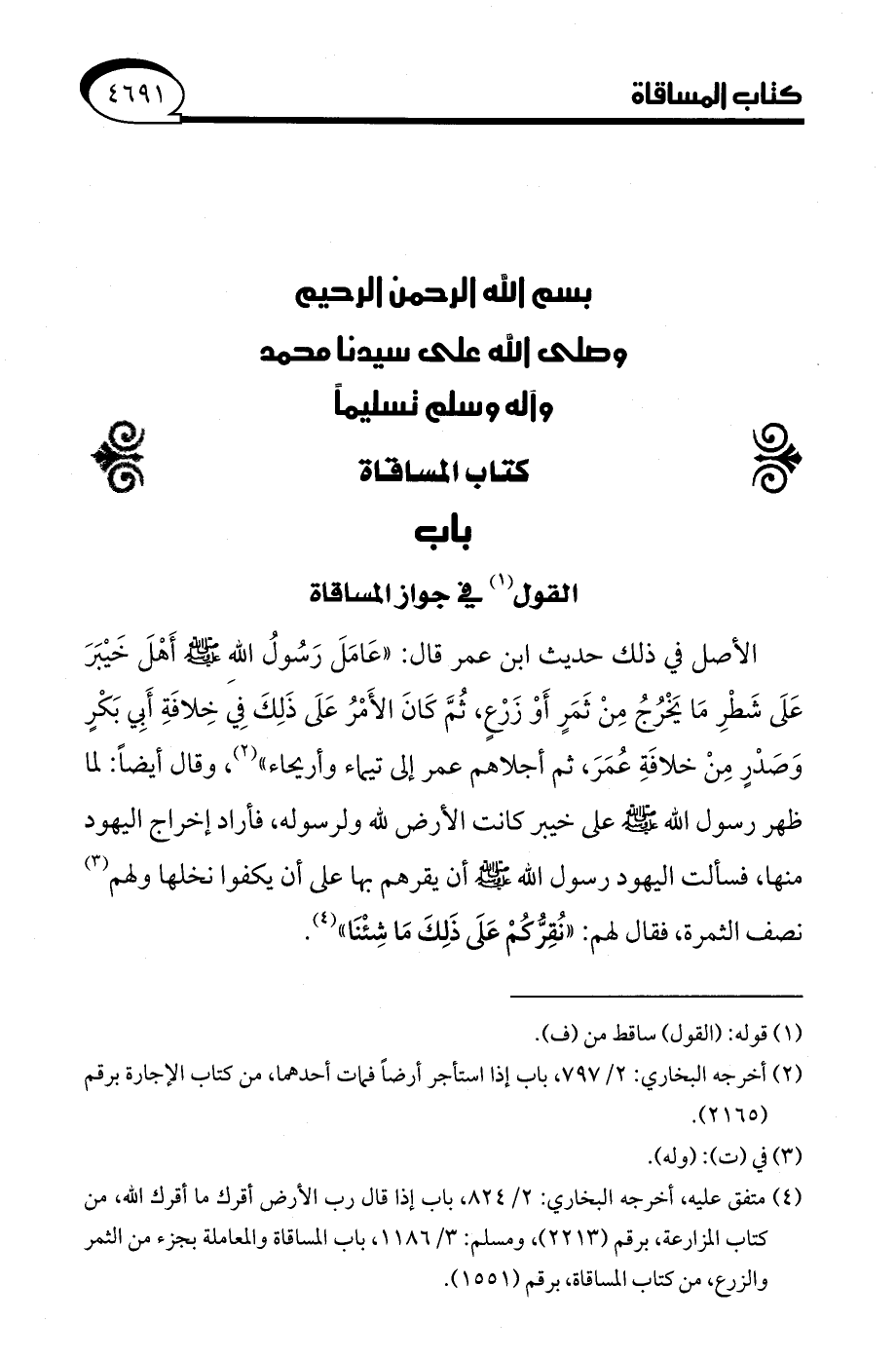 (¬4) متفق عليه أخرجه البخاري: 2/ 824، باب إذا قال رب الأرض أقرك ما أقرك الله، من كتاب المزارعة، برقم (2213)، ومسلم: 3/ 1186، باب المساقاة والمعاملة بجزء من الثمر والزرع، من كتاب المساقاة، برقم (1551).