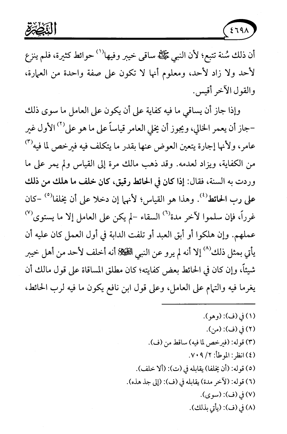 وإذا جاز أن يساقي ما فيه كفاية على أن يكون على العامل ما سوى ذلك - جاز أن يعمر الخالي، ويجوز أن يخلي العامر قياسًا على ما هو على (¬2) الأول غير عامر، ولأنها إجارة يتعين العوض عنها بقدر ما يتكلف فيه فيرخص لما فيه (¬3) من الكفاية، ويزاد لعدمه. وقد ذهب مالك مرة إلى القياس ولم يمر على ما وردت به السنة، فقال: إذا كان في الحائط رقيق، كان خلف ما هلك من ذلك على رب الحائط (¬4). وهذا هو القياس؛ لأنهما إن دخلا على أن يخلفا (¬5) -كان غررًا، فإن سلموا لآخر مدة (¬6) السقاء- لم يكن على العامل إلا ما يستوى (¬7) عملهم. وإن هلكوا أو أبق العبد أو تلفت الدابة في أول العمل كان عليه أن يأتي بمثل ذلك (¬8) إلا أنه لم يرو عن النبي -عليه السلام- أنه أخلف لأحد من أهل خيبر شيئًا، وإن كان في الحائط بعض كفايته، كان مطلق المساقاة على قول مالك أن يغرما فيه والتمام على العامل، وعلى قول ابن نافع يكون ما فيه لرب الحائط،
