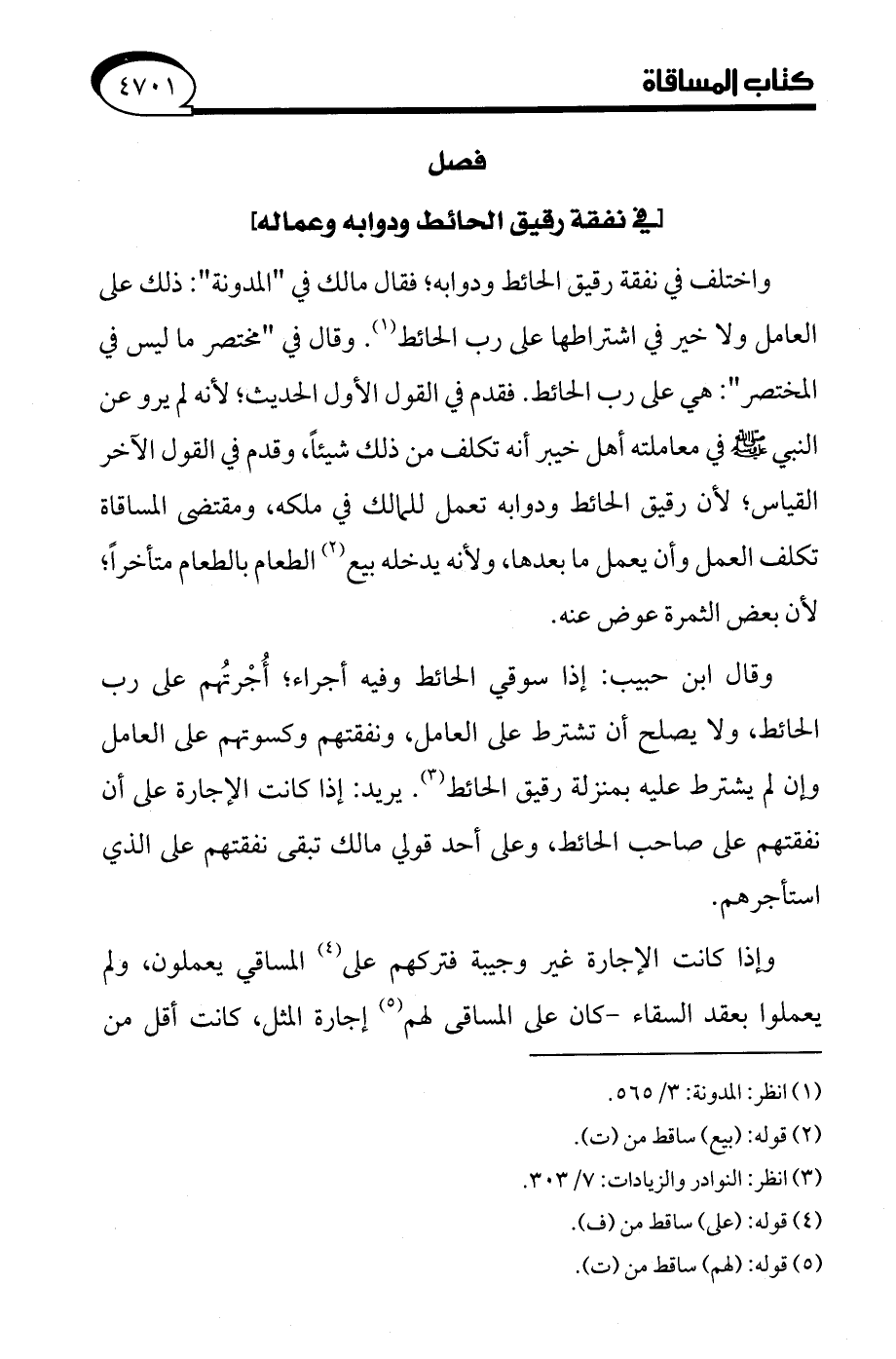 وقال ابن حبيب: إذا سوقي الحائط وفيه أجراء، أُجْرتُهم على رب الحائط، ولا يصلح أن تشترط على العامل، ونفقتهم وكسوتهم على العامل وإن لم يشترط عليه بمنزلة رقيق الحائط (¬3). يريد: إذا كانت الإجارة على أن نفقتهم على صاحب الحائط، وعلى أحد قولي مالك تبقى نفقتهم على الذي استأجرهم.