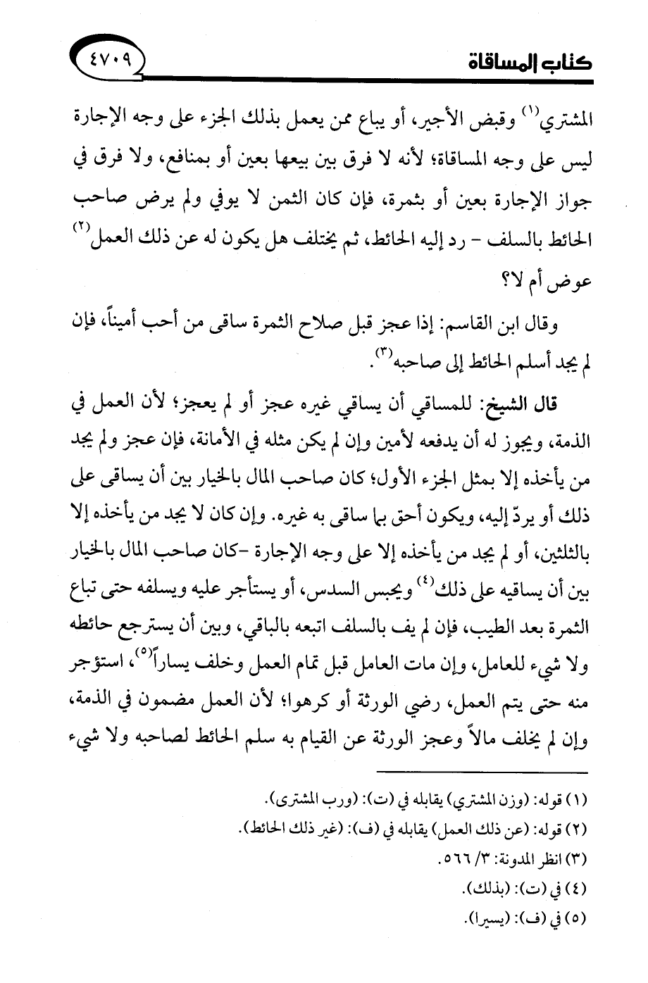 قال الشيخ: للمساقي أن يساقي غيره عجز أو لم يعجز؛ لأن العمل في الذمة، ويجوز له أن يدفعه لأمين وإن لم يكن مثله في الأمانة، فإن عجز ولم يجد من يأخذه إلا بمثل الجزء الأول، كان صاحب المال بالخيار بين أن يساقى على ذلك أو يردّ إليه، ويكون أحق بما ساقى به غيره. وإن كان لا يجد من يأخذه إلا بالثلثين، أو لم يجد من يأخذه إلا على وجه الإجارة- كان صاحب المال بالخيار بين أن يساقيه على ذلك (¬4) ويحبس السدس، أو يستأجر عليه ويسلفه حتى تباع الثمرة بعد الطيب، فإن لم يف بالسلف اتبعه بالباقي، وبين أن يسترجع حائطه ولا شيء للعامل، وإن مات العامل قبل تمام العمل وخلف يسارًا (¬5)، استؤجر منه حتى يتم العمل، رضي الورثة أو كرهوا؛ لأن العمل مضمون في الذمة، وإن لم يخلف مالًا وعجز الورثة عن القيام به سلم الحائط لصاحبه ولا شيء