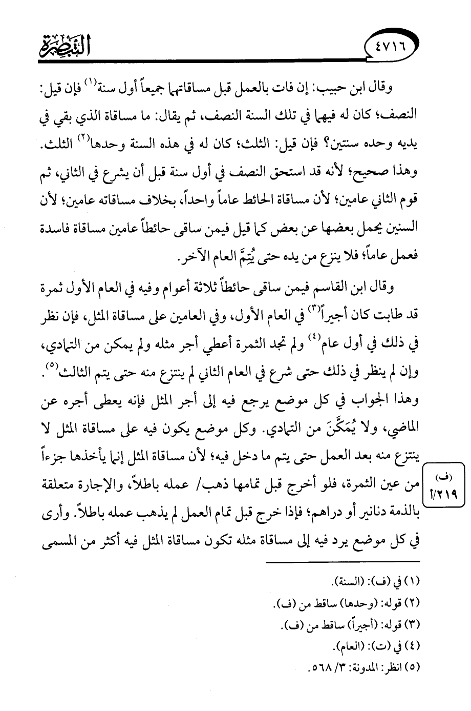 وقال ابن حبيب: إن فات بالعمل قبل مساقاتهما جميعًا أول سنة (¬1) فإن قيل: النصف، كان له فيهما في تلك السنة النصف، ثم يقال: ما مساقاة الذي بقي في يديه وحده سنتين؟ فإن قيل: الثلث؛ كان له في هذه السنة وحدها (¬2) الثلث. وهذا صحيح؛ لأنه قد استحق النصف في أول سنة قبل أن يشرع في الثاني، ثم قوم الثاني عامين؛ لأن مساقاة الحائط عامًا واحدًا، بخلاف مساقاته عامين؛ لأن السنين يحمل بعضها عن بعض كما قيل فيمن ساقى حائطًا عامين مساقاة فاسدة فعمل عامًا، فلا ينزع من يده حتى يُتِمَّ العام الآخر.