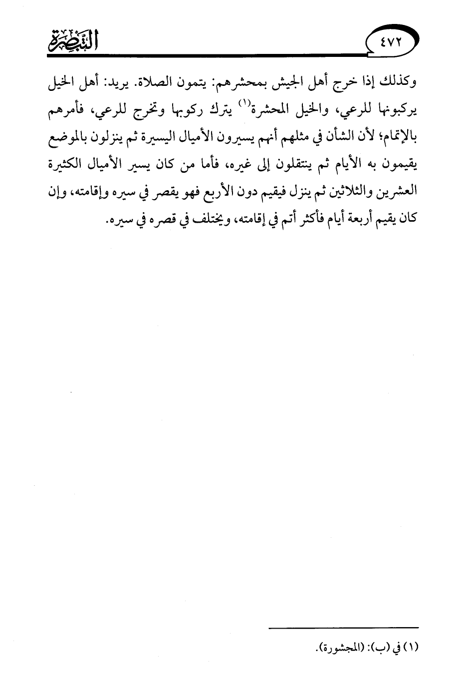 وكذلك إذا خرج أهل الجيش بمحشرهم: يتمون الصلاة. يريد: أهل الخيل يركبونها للرعي، والخيل المحشرة (¬1) يترك ركوبها وتخرج للرعي، فأمرهم بالإتمام؛ لأن الشأن في مثلهم أنهم يسيرون الأميال اليسيرة ثم ينزلون بالموضع يقيمون به الأيام ثم ينتقلون إلى غيره، فأما من كان يسير الأميال الكثيرة العشرين والثلاثين ثم ينزل فيقيم دون الأربع فهو يقصر في سيره وإقامته، وإن كان يقيم أربعة أيام فأكثر أتم في إقامته، ويختلف في قصره في سيره.