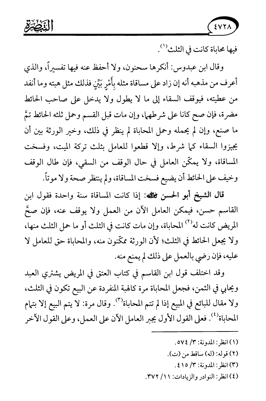 وقال ابن عبدوس: أنكرها سحنون، ولا أحفظ عنه فيها تفسيرًا، والذي أعرف من مذهبه أنه إن زاد على مساقاة مثله بِأَمْرٍ بَيَّنٍ فذلك مثل هبته وما أنفد من عطيته، فيوقف السقاء إلى ما لا يطول ولا يدخل على صاحب الحائط مضرة، فإن صح كانا على شرطهما، وإن مات قبل القسم وحمل ثلثه الحائط تمَّ ما صنع، وإن لم يحمله وحمل المحاباة لم ينظر في ذلك، وخير الورثة بين أن يجيزوا السقاء كما شرط، وإلا قطعوا للعامل بثلث تركة الميت، وفسخت المساقاة، ولا يمكّن العامل في حال الوقف من السقي، فإن طال الوقف وخيف على الحائط أن يضيع فسخت المساقاة، ولم ينتظر صحة ولا موتًا.