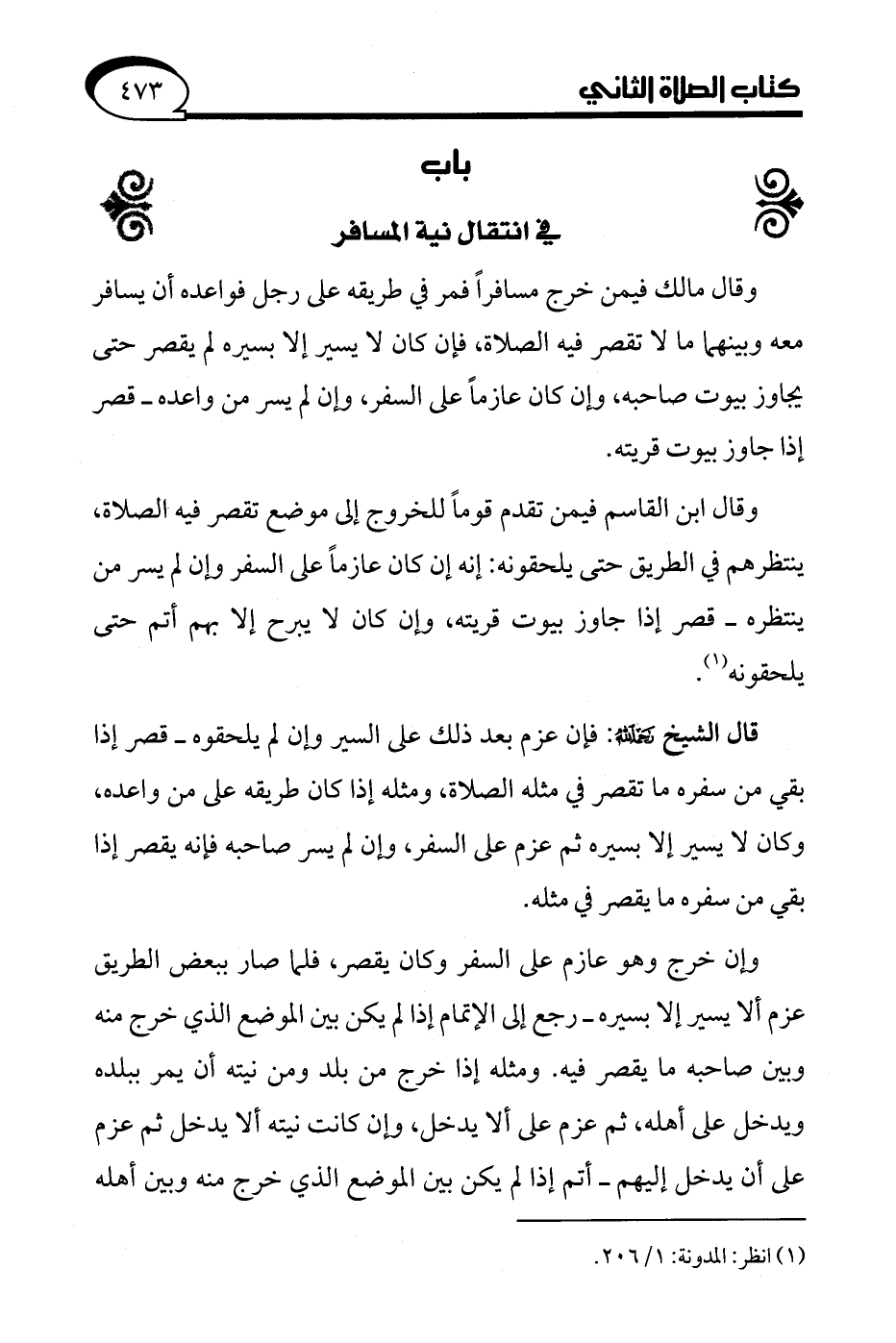 وقال ابن القاسم فيمن تقدم قومًا للخروج إلى موضع تقصر فيه الصلاة، ينتظرهم في الطريق حتى يلحقونه: إنه إن كان عازمًا على السفر وإن لم يسر من ينتظره - قصر إذا جاوز بيوت قريته، وإن كان لا يبرح إلا بهم أتم حتى يلحقونه (¬1).