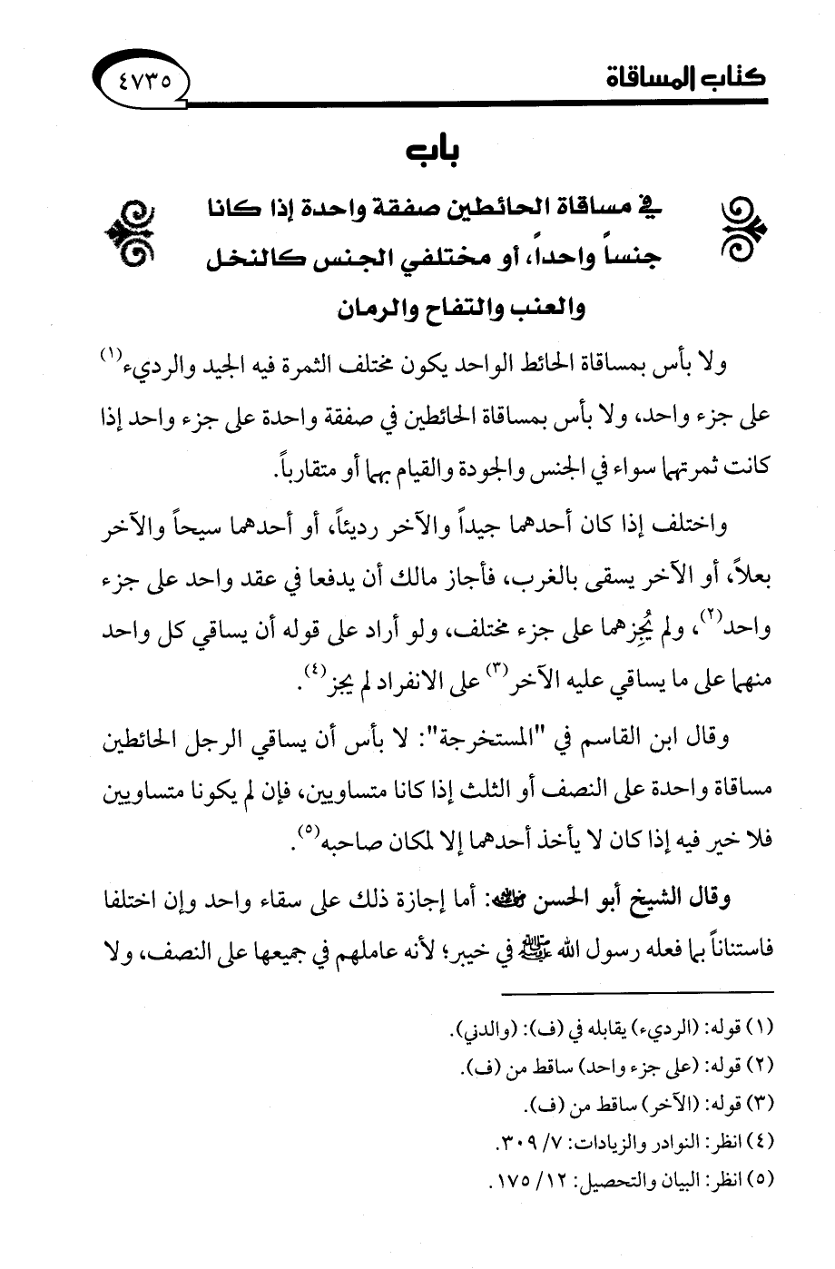 ولا بأس بمساقاة الحائط الواحد يكون مختلف الثمرة فيه الجيد والرديء (¬1) على جزء واحد، ولا بأس بمساقاة الحائطين في صفقة واحدة على جزء واحد إذا كانت ثمرتهما سواء في الجنس والجودة والقيام بهما أو متقاربًا.