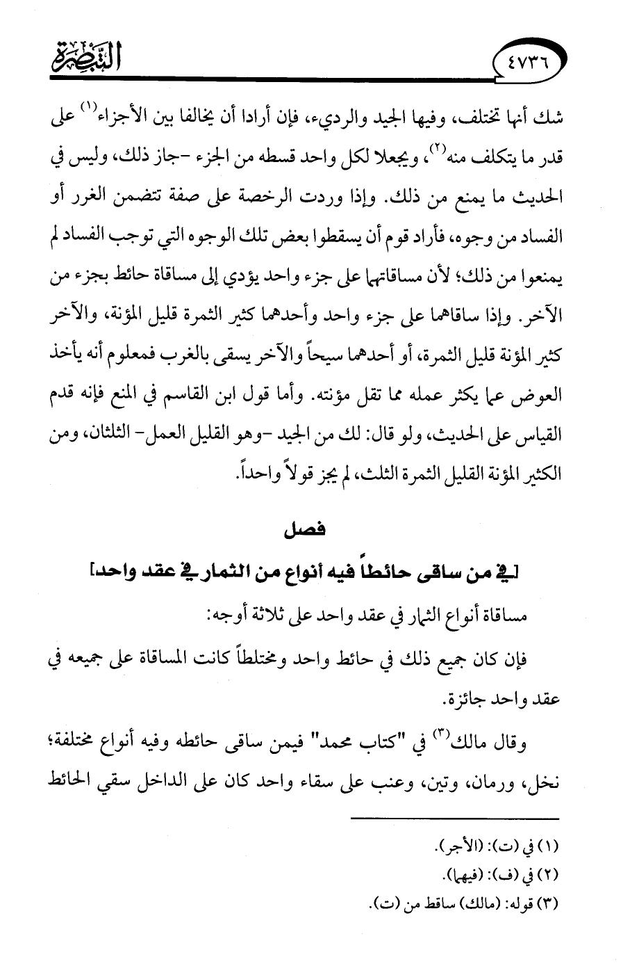 شك أنها تختلف، وفيها الجيد والرديء، فإن أرادا أن يخالفا بين الأجزاء (¬1) على قدر ما يتكلف منه (¬2)، ويجعلا لكل واحد قسطه من الجزء- جاز ذلك، وليس في الحديث ما يمنع من ذلك. وإذا وردت الرخصة على صفة تتضمن الغرر أو الفساد من وجوه، فأراد قوم أن يسقطوا بعض تلك الوجوه التي توجب الفساد لم يمنعوا من ذلك؛ لأن مساقاتهما على جزء واحد يؤدي إلى مساقاة حائط بجزء من الآخر. وإذا ساقاهما على جزء واحد وأحدهما كثير الثمرة قليل المؤنة، والآخر كثير المؤنة قليل الثمرة، أو أحدهما سيحًا والآخر يسقى بالغرب فمعلوم أنه يأخذ العوض عما يكثر عمله مما تقل مؤنته. وأما قول ابن القاسم في المنع فإنه قدم القياس على الحديث، ولو قال: لك من الجيد -وهو القليل العمل- الثلثان، ومن الكثير المؤنة القليل الثمرة الثلث، لم يجز قولًا واحدًا.
