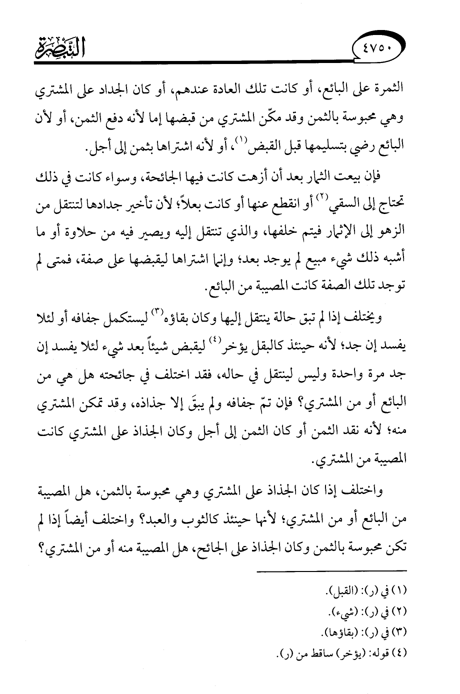 ويختلف إذا لم تبق حالة ينتقل إليها وكان بقاؤه (¬3) ليستكمل جفافه أو لئلا يفسد إن جد؛ لأنه حينئذ كالبقل يؤخر (¬4) ليقبض شيئًا بعد شيء لئلا يفسد إن جد مرة واحدة وليس لينتقل في حاله، فقد اختلف في جائحته هل هي من البائع أو من المشتري؟ فإن تمّ جفافه ولم يبقَ إلا جذاذه، وقد تمكن المشتري منه؛ لأنه نقد الثمن أو كان الثمن إلى أجل وكان الجذاذ على المشتري كانت المصيبة من المشتري.