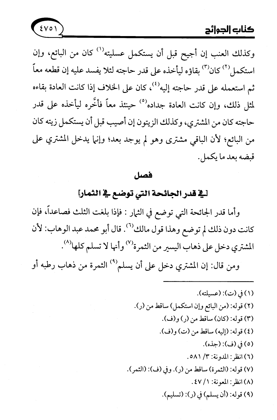 وكذلك العنب إن أجيح قبل أن يستكمل عسليته (¬1) كان من البائع، وإن استكمل (¬2) كان (¬3) بقاؤه ليأخذه على قدر حاجته لئلا يفسد عليه إن قطعه معًا ثم استعمله على قدر حاجته إليه (¬4)، كان على الخلاف إذا كانت العادة بقاءه لمثل ذلك، وإن كانت العادة جداده (¬5) حينئذ معًا فأخَّره ليأخذه على قدر حاجته كان من المشتري، وكذلك الزيتون إن أصيب قبل أن يستكمل زيته كان من البائع؛ لأن الباقي مشترى وهو لم يوجد بعد؛ وإنما يدخل المشتري على قبضه بعد ما يكمل.
