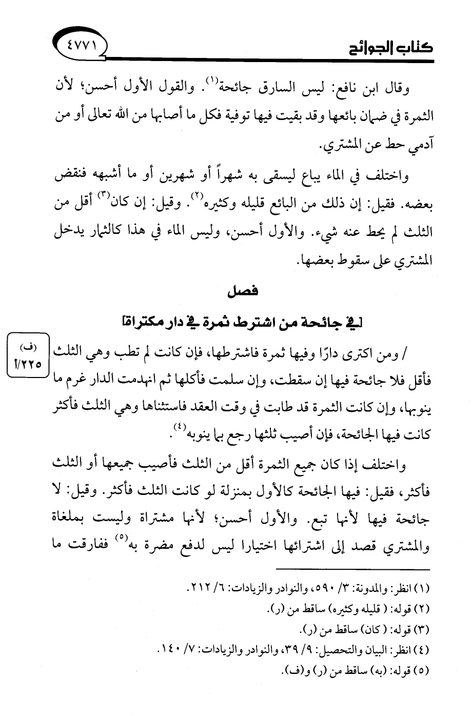 واختلف إذا كان جميع الثمرة أقل من الثلث فأصيب جميعها أو الثلث فأكثر، فقيل: فيها الجائحة كالأول بمنزلة لو كانت الثلث فأكثر. وقيل: لا جائحة فيها لأنها تبع. والأول أحسن؛ لأنها مشتراة وليست بملغاة والمشتري قصد إلى اشترائها اختيارا ليس لدفع مضرة به (¬5) ففارقت ما