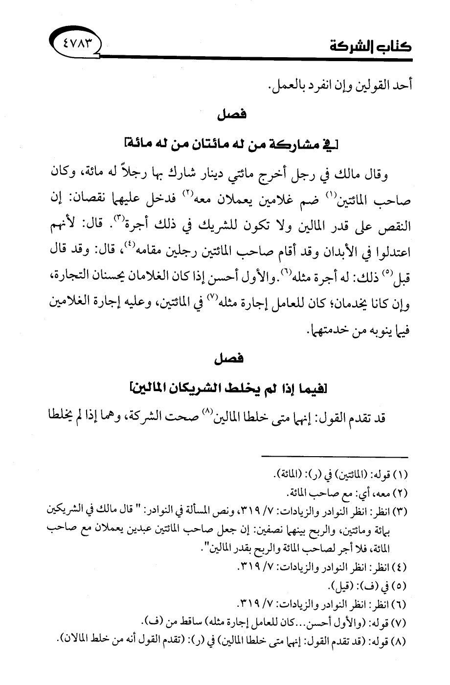 (¬3) انظر: انظر النوادر والزيادات: 7/ 319، ونص المسألة في النوادر: "قال مالك في الشريكين بمائة ومائتين، والربح بينهما نصفين: إن جعل صاحب المائتين عبدين يعملان مع صاحب المائة، فلا أجر لصاحب المائة والربح بقدر المالين".