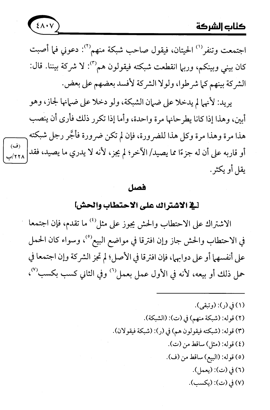 اجتمعت وتنفر (¬1) الحيتان، فيقول صاحب شبكة منهم (¬2): دعوني فما أصبت كان بيني وبينكم، وربما انقطعت شبكته فيقولون هم (¬3): لا شركة بيننا. قال: الشركة بينهم كما شرطوا، ولولا الشركة لأفسد بعضهم على بعض.
