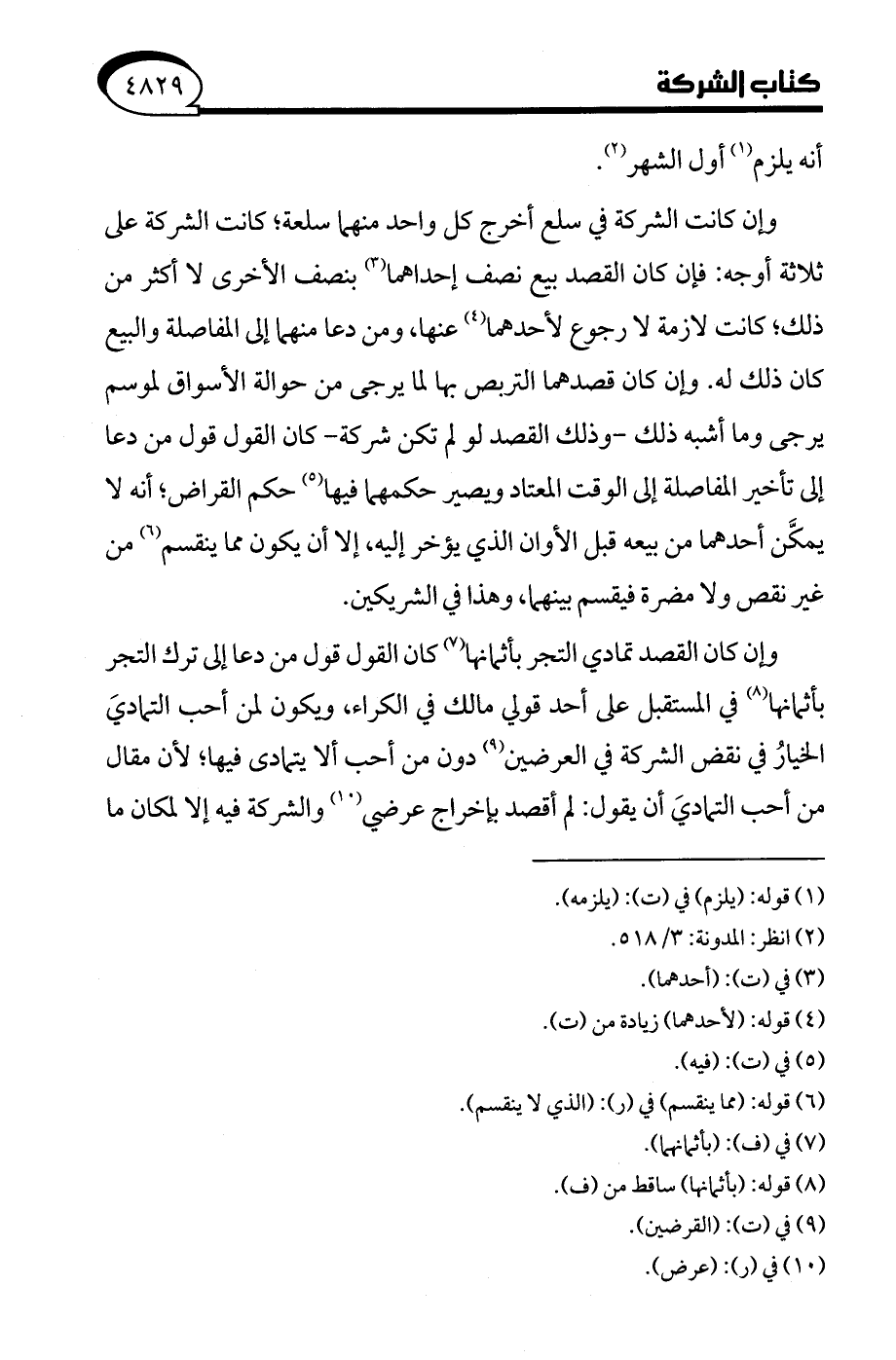 وإن كانت الشركة في سلع أخرج كل واحد منهما سلعة، كانت الشركة على ثلاثة أوجه: فإن كان القصد بيع نصف إحداهما (¬3) بنصف الأخرى لا أكثر من ذلك، كانت لازمة لا رجوع لأحدهما (¬4) عنها، ومن دعا منهما إلى المفاصلة والبيع كان ذلك له. وإن كان قصدهما التربص بها لما يرجى من حوالة الأسواق لموسم يرجى وما أشبه ذلك -وذلك القصد لو لم تكن شركة- كان القول قول من دعا إلى تأخير المفاصلة إلى الوقت المعتاد ويصير حكمهما فيها (¬5) حكم القراض، أنه لا يمكَّن أحدهما من بيعه قبل الأوان الذي يؤخر إليه، إلا أن يكون مما ينقسم (¬6) من غير نقص ولا مضرة فيقسم بينهما، وهذا في الشريكين.