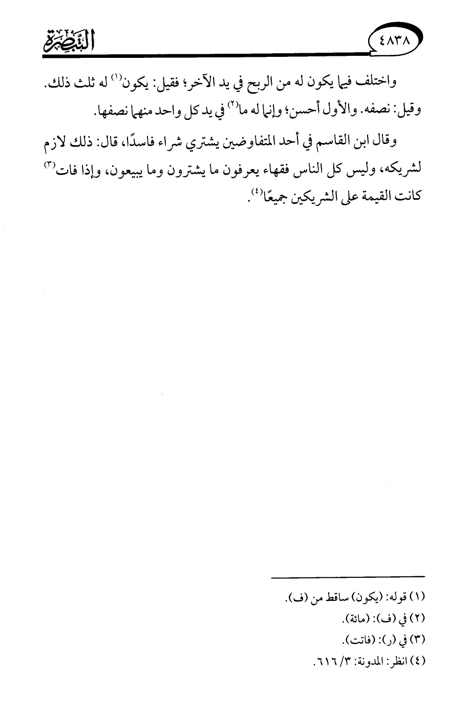 وقال ابن القاسم في أحد المتفاوضين يشتري شراء فاسدًا، قال: ذلك لازم لشريكه، وليس كل الناس فقهاء يعرفون ما يشترون وما يبيعون، وإذا فات (¬3) كانت القيمة على الشريكين جميعًا (¬4).