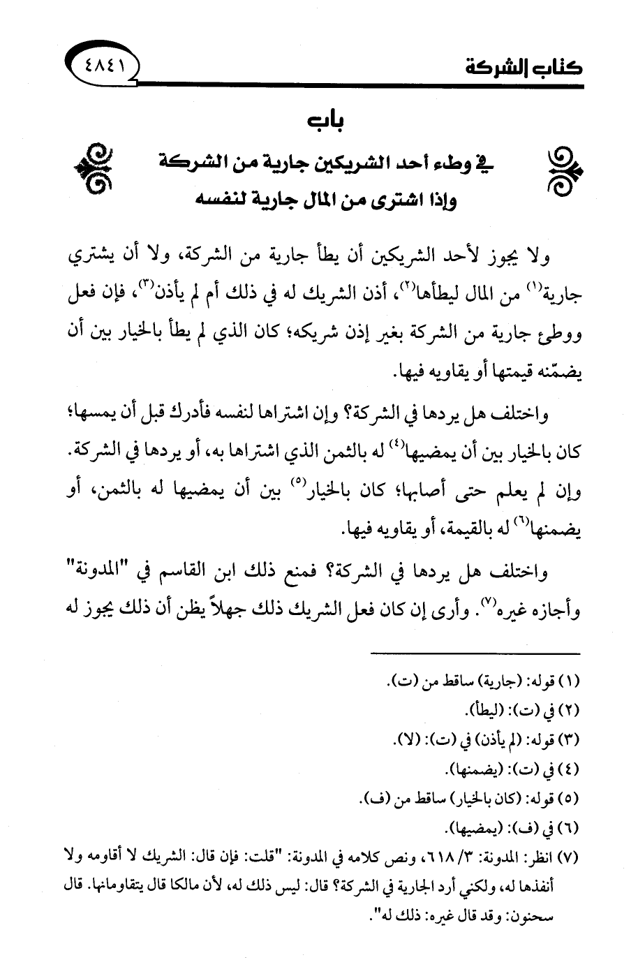 (¬7) انظر: المدونة: 3/ 618، ونص كلامه في المدونة: "قلت: فإن قال: الشريك لا أقاومه ولا أنفذها له، ولكني أرد الجارية في الشركة؟ قال: ليس ذلك له؛ لأن مالكا قال يتقاومانها. قال سحنون: وقد قال غيره: ذلك له".