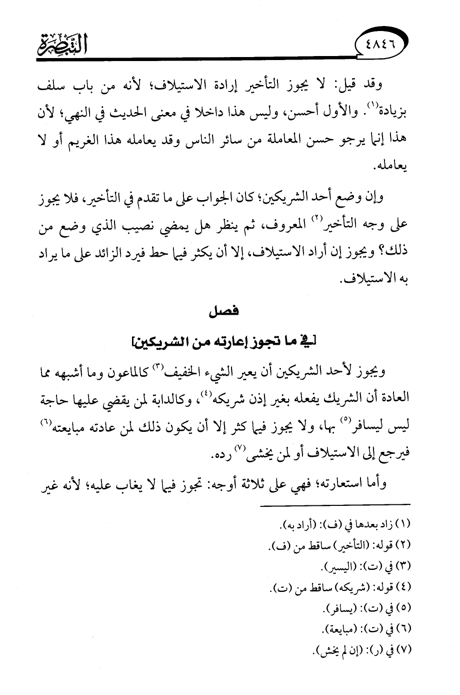 ويجوز لأحد الشريكين أن يعير الشيء الخفيف (¬3) كالماعون وما أشبهه مما العادة أن الشريك يفعله بغير إذن شريكه (¬4)، وكالدابة لمن يقضي عليها حاجة ليس ليسافر (¬5) بها، ولا يجوز فيما كثر إلا أن يكون ذلك لمن عادته مبايعته (¬6) فيرجع إلى الاستيلاف أو لمن يخشى (¬7) رده.
