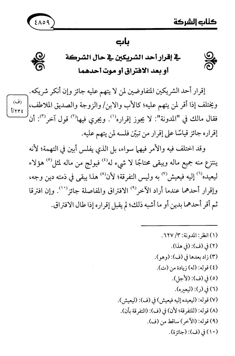 باب في إقرار أحد الشريكين في حال الشركة أو بعد الافتراق أو موت أحدهما