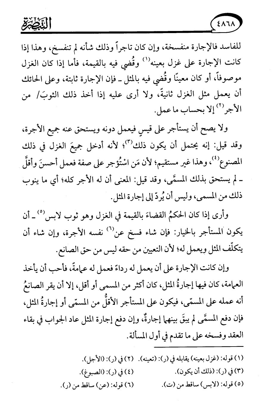 وأرى إذا كان الحكمُ القضاءَ بالقيمة في الغزل وهو ثوب لابس (¬5) - أن يكون المستأجر بالخيار: فإن شاء فسخ عن (¬6) نفسه الأجرة، وإن شاء أن يتكلّف المثل ويعمل له؛ لأن التعيين من حقه ليس من حق الصانع.