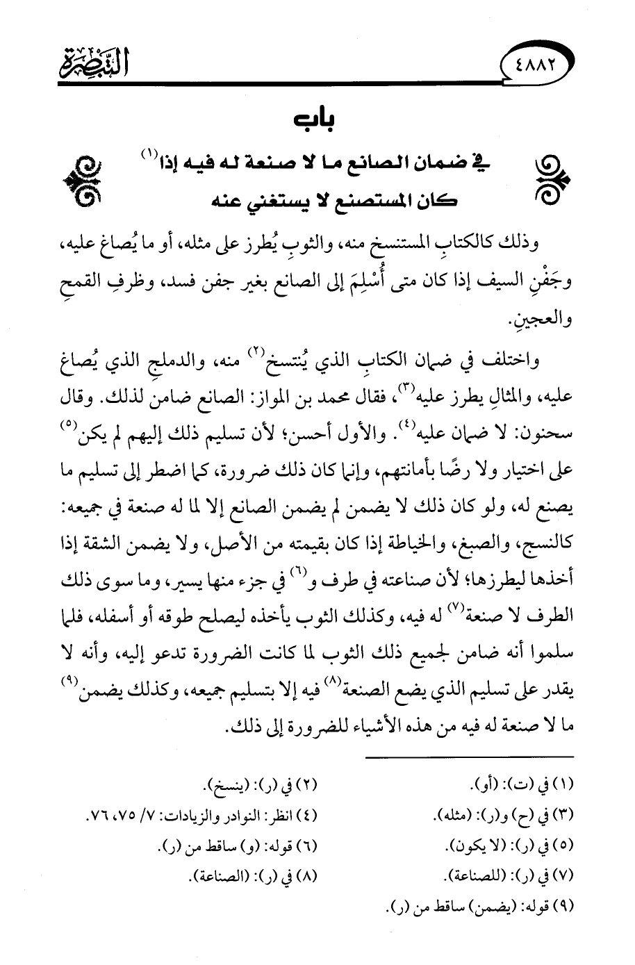 واختلف في ضمان الكتابِ الذي يُنتسخ (¬2) منه، والدملجِ الذي يُصاغ عليه، والمثالِ يطرز عليه (¬3)، فقال محمد بن المواز: الصانع ضامن لذلك. وقال سحنون: لا ضمان عليه (¬4). والأول أحسن؛ لأن تسليم ذلك إليهم لم يكن (¬5) على اختيار ولا رضًا بأمانتهم، وإنما كان ذلك ضرورة، كما اضطر إلى تسليم ما يصنع له، ولو كان ذلك لا يضمن لم يضمن الصانع إلا لما له صنعة في جميعه: كالنسج، والصبغ، والخياطة إذا كان بقيمته من الأصل، ولا يضمن الشقة إذا أخذها ليطرزها؛ لأن صناعته في طرف و (¬6) في جزء منها يسير، وما سوى ذلك الطرف لا صنعة (¬7) له فيه، وكذلك الثوب يأخذه ليصلح طوقه أو أسفله، فلما سلموا أنه ضامن لجميع ذلك الثوب لما كانت الضرورة تدعو إليه، وأنه لا يقدر على تسليم الذي يضع الصنعة (¬8) فيه إلا بتسليم جميعه، وكذلك يضمن (¬9) ما لا صنعة له فيه من هذه الأشياء للضرورة إلى ذلك.