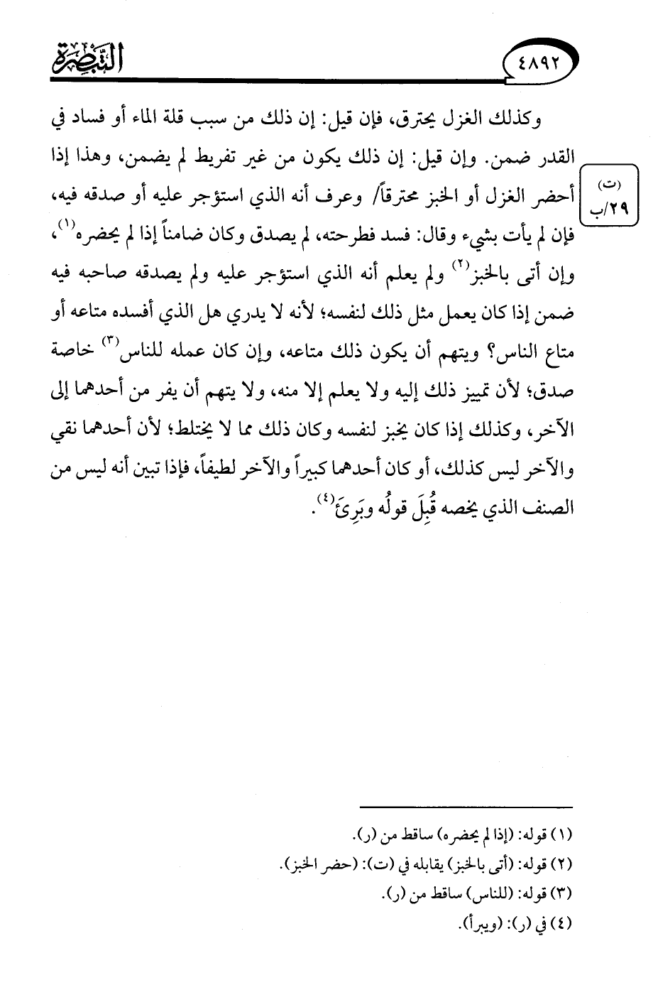 وكذلك الغزل يحترق، فإن قيل: إن ذلك من سبب قلة الماء أو فساد في القدر ضمن. وإن قيل: إن ذلك يكون من غير تفريط لم يضمن، وهذا إذا أحضر الغزل أو الخبز محترقًا وعرف أنه الذي استؤجر عليه أو صدقه فيه، فإن لم يأت بشيء وقال: فسد فطرحته، لم يصدق وكان ضامنًا إذا لم يحضره (¬1)، وإن أتى بالخبز (¬2) ولم يعلم أنه الذي استؤجر عليه ولم يصدقه صاحبه فيه ضمن إذا كان يعمل مثل ذلك لنفسه؛ لأنه لا يدري هل الذي أفسده متاعه أو متاع الناس؟ ويتهم أن يكون ذلك متاعه، وإن كان عمله للناس (¬3) خاصة صدق؛ لأن تمييز ذلك إليه ولا يعلم إلا منه، ولا يتهم أن يفر من أحدهما إلى الآخر، وكذلك إذا كان يخبز لنفسه وكان ذلك مما لا يختلط؛ لأن أحدهما نقي والآخر ليس كذلك، أو كان أحدهما كبيرًا والآخر لطيفًا، فإذا تبين أنه ليس من الصنف الذي يخصه قُبِلَ قولُه وبَرِئَ (¬4).