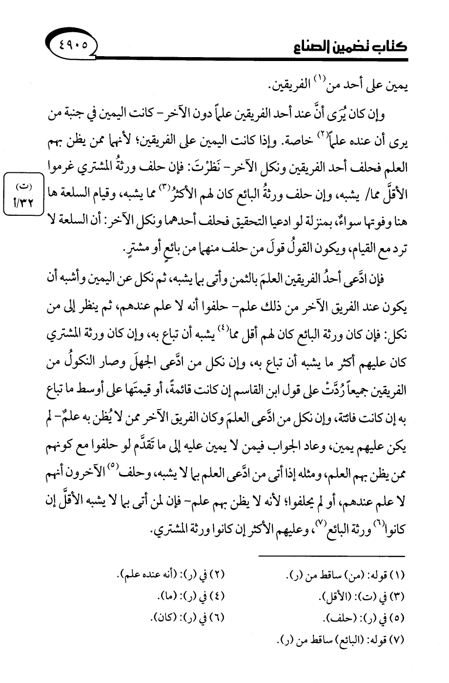 وإن كان يُرَى أنَّ عند أحد الفريقين علمًا دون الآخر - كانت اليمين في جنبة من يرى أن عنده علمًا (¬2) خاصة. وإذا كانت اليمين على الفريقين؛ لأنهما ممن يظن بهم العلم فحلف أحد الفريقين ونكل الآخر - نَظرْتَ: فإن حلف ورثةُ المشتري غرموا الأقلَّ مما يشبه، وإن حلف ورثةُ البائع كان لهم الأكثرُ (¬3) مما يشبه، وقيام السلعة ها هنا وفوتها سواءٌ، بمنزلة لو ادعيا التحقيق فحلف أحدهما ونكل الآخر: أن السلعة لا ترد مع القيام، ويكون القولُ قولَ من حلف منهما من بائعٍ أو مشترٍ.
