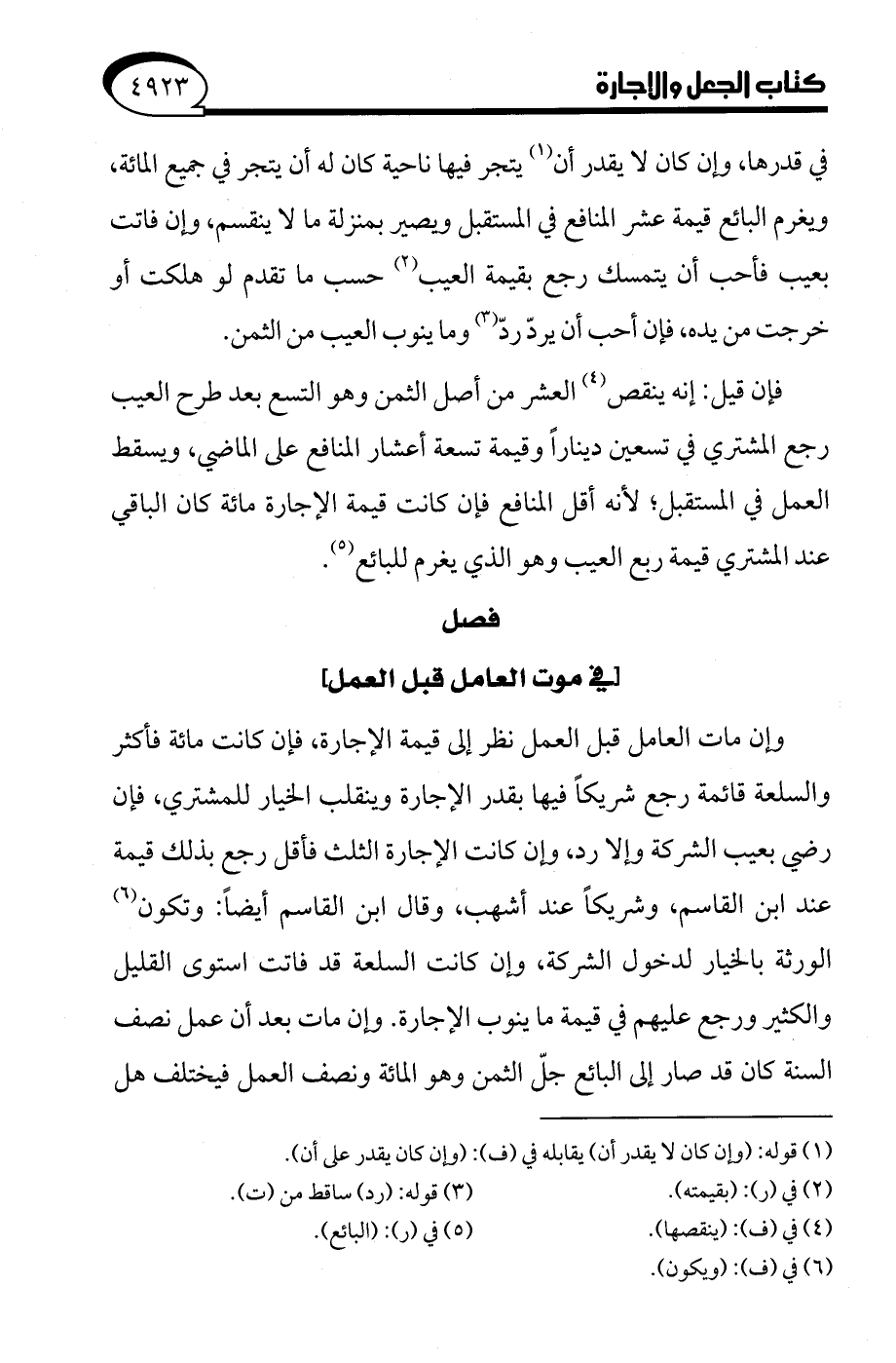 وإن مات العامل قبل العمل نظر إلى قيمة الإجارة، فإن كانت مائة فأكثر والسلعة قائمة رجع شريكًا فيها بقدر الإجارة وينقلب الخيار للمشتري، فإن رضي بعيب الشركة وإلا رد، وإن كانت الإجارة الثلث فأقل رجع بذلك قيمة عند ابن القاسم، وشريكًا عند أشهب، وقال ابن القاسم أيضًا: وتكون (¬6) الورثة بالخيار لدخول الشركة، وإن كانت السلعة قد فاتت استوى القليل والكثير ورجع عليهم في قيمة ما ينوب الإجارة. وإن مات بعد أن عمل نصف السنة كان قد صار إلى البائع جلّ الثمن وهو المائة ونصف العمل فيختلف هل