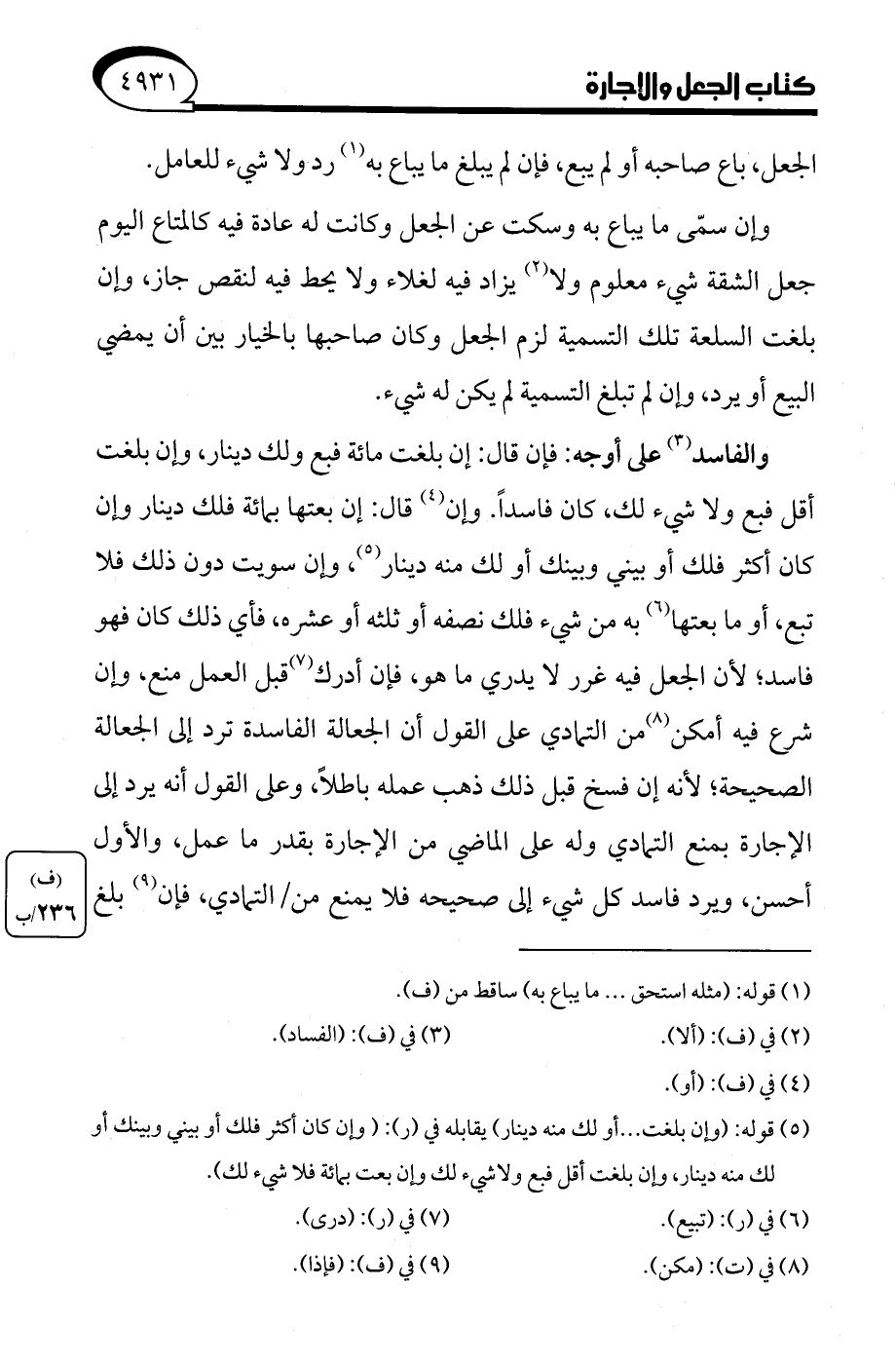 والفاسد (¬3) على أوجه: فإن قال: إن بلغت مائة فبع ولك دينار، وإن بلغت أقل فبع ولا شيء لك، كان فاسدًا. وإن (¬4) قال: إن بعتها بمائة فلك دينار وإن كان أكثر فلك أو بيني وبينك أو لك منه دينار (¬5)، وإن سويت دون ذلك فلا تبع، أو ما بعتها (¬6) به من شيء فلك نصفه أو ثلثه أو عشره، فأي ذلك كان فهو فاسد؛ لأن الجعل فيه غرر لا يدري ما هو، فإن أدرك (¬7) قبل العمل منع، وإن شرع فيه أمكن (¬8) من التمادي على القول أن الجعالة الفاسدة ترد إلى الجعالة الصحيحة؛ لأنه إن فسخ قبل ذلك ذهب عمله باطلًا، وعلى القول أنه يرد إلى الإجارة بمنع التمادي وله على الماضي من الإجارة بقدر ما عمل، والأول أحسن، ويرد فاسد كل شيء إلى صحيحه فلا يمنع من التمادي، فإن (¬9) بلغ