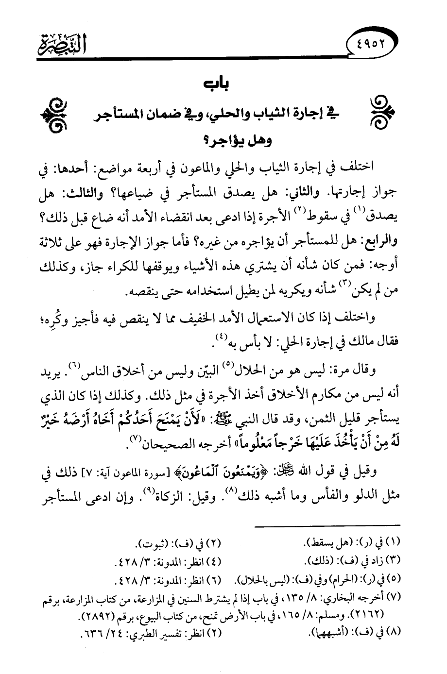 وقيل في قول الله -عز وجل-: {وَيَمْنَعُونَ الْمَاعُونَ} [سورة الماعون آية: 7] ذلك في مثل الدلو والفأس وما أشبه ذلك (¬8). وقيل: الزكاة (¬9). وإن ادعى المستأجر