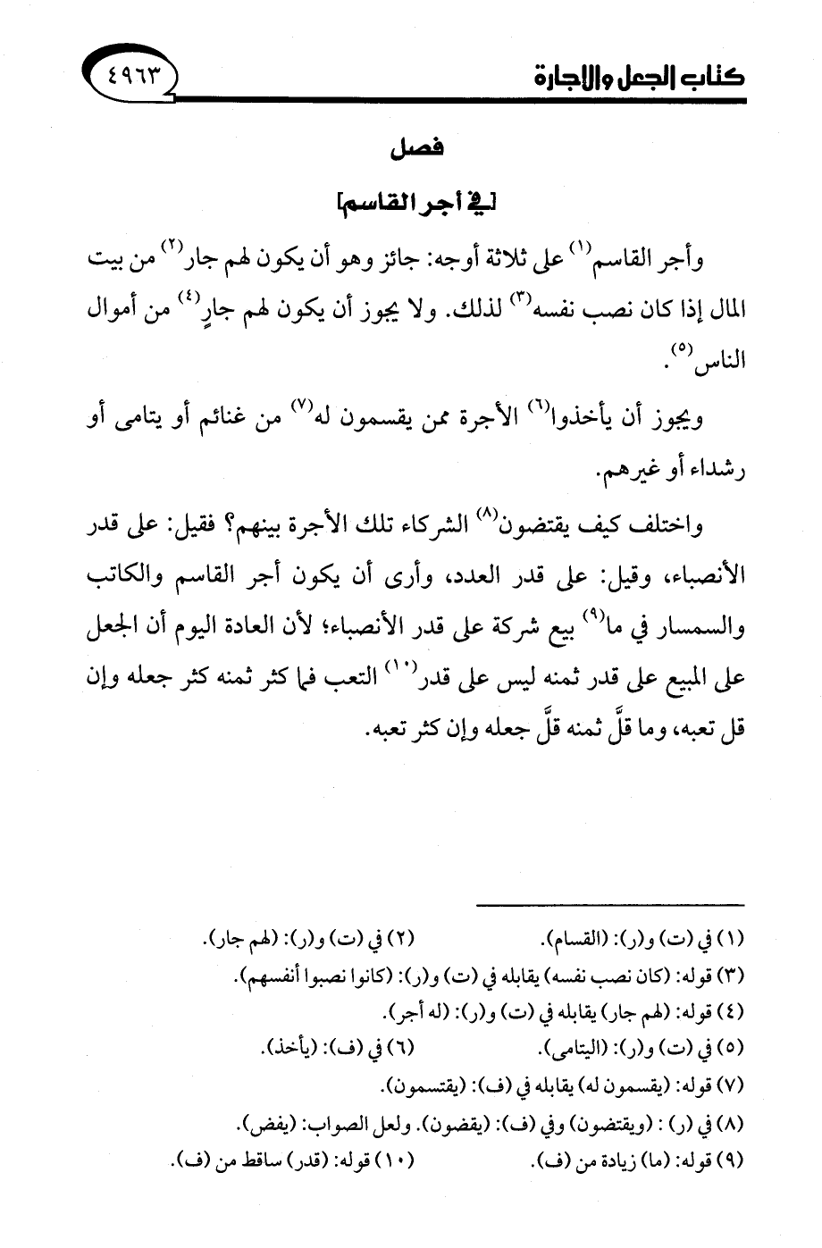وأجر القاسم (¬1) على ثلاثة أوجه: جائز وهو أن يكون لهم جار (¬2) من بيت المال إذا كان نصبا نفسه (¬3) لذلك. ولا يجوز أن يكون لهم جارٍ (¬4) من أموال الناس (¬5).