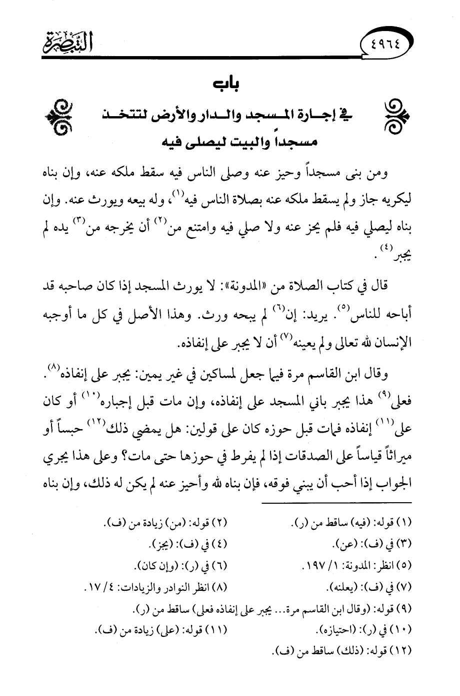 وقال ابن القاسم مرة فيما جعل لمساكين في غير يمين: يجبر على إنفاذه (¬8). فعلى (¬9) هذا يجبر باني المسجد على إنفاذه، وإن مات قبل إجباره (¬10) أو كان على (¬11) إنفاذه فمات قبل حوزه كان على قولين: هل يمضي ذلك (¬12) حبسًا أو ميراثًا قياسًا على الصدقات إذا لم يفرط في حوزها حتى مات؟ وعلى هذا يجري الجواب إذا أحب أن يبني فوقه، فإن بناه لله وأحيز عنه لم يكن له ذلك، وإن بناه