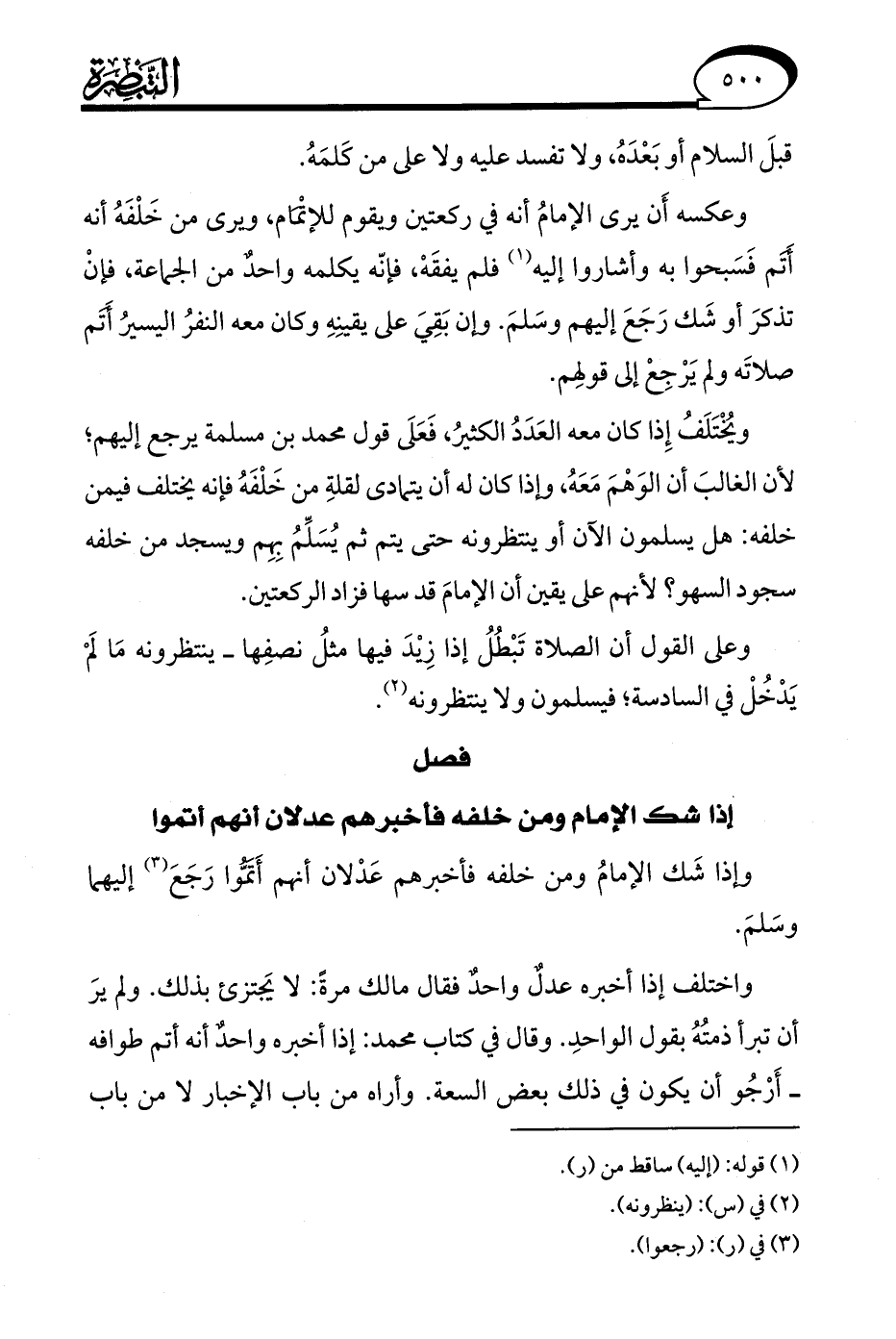 وعكسه أَن يرى الإمامُ أنه في ركعتين ويقوم للإتْمَام، ويرى من خَلْفَهُ أنه أَتَم فَسَبحوا به وأشاروا إليه (¬1) فلم يفقَهْ، فإنّه يكلمه واحدٌ من الجماعة، فإنْ تذكرَ أو شَك رَجَعَ إليهم وسَلمَ. وإن بَقِيَ على يقينِهِ وكان معه النفرُ اليسيرُ أَتَم صلاتَه ولم يَرْجِعْ إلى قولهِم.