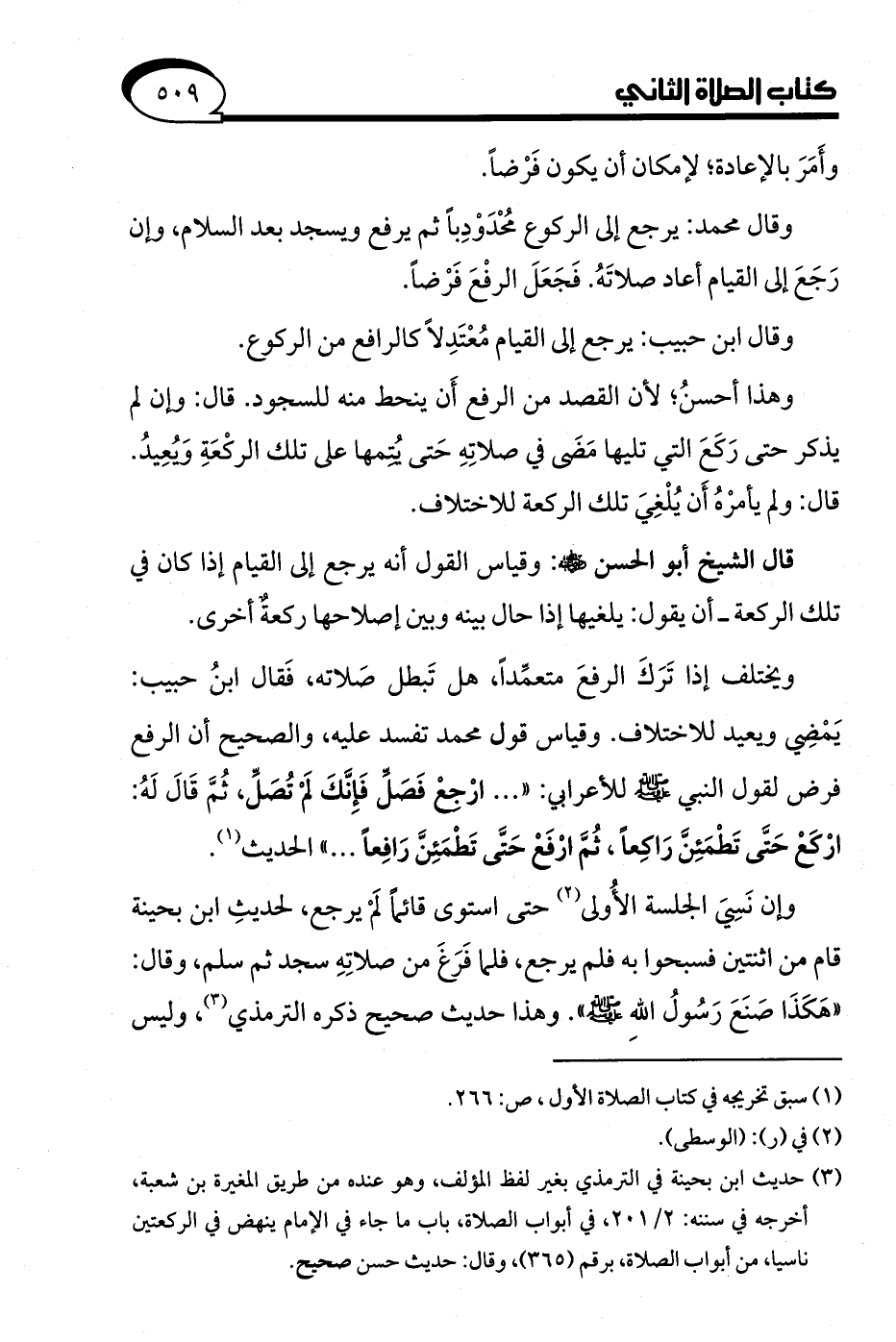 ويختلف إذا تَرَكَ الرفعَ متعمِّدًا، هل تَبطل صَلاته، فَقال ابنُ حبيب: يَمْضِي ويعيد للاختلاف. وقياس قول محمد تفسد عليه، والصحيح أن الرفع فرض لقول النبي - صلى الله عليه وسلم - للأعرابي: ". . .ارْجعْ فَصَلِّ فَإِنَّكَ لَمْ تُصَلِّ، ثُمَّ قَالَ لَهُ: ارْكَعْ حَتَّى تَطْمَئِنَّ رَاكلعًا، ثُمَّ ارْفَعْ حَتَّى تَطْمَئِنَّ رَافِعًا. . ." الحديث (¬1).