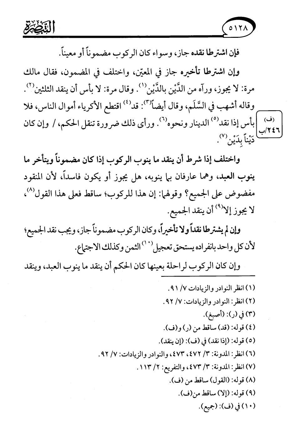 واختلف إذا شرط أن ينقد ما ينوب الركوب إذا كان مضمونًا ويتأخر ما ينوب العبد، وهما عارفان بما ينوبه، هل يجوز أو يكون فاسدًا؛ لأن المنقود مفضوض على الجميع؟ وقولهما: إن هذا للركوب، ساقط فعلى هذا القول (¬8)، لا يجوز إلا (¬9) أن ينقد الجميع.
