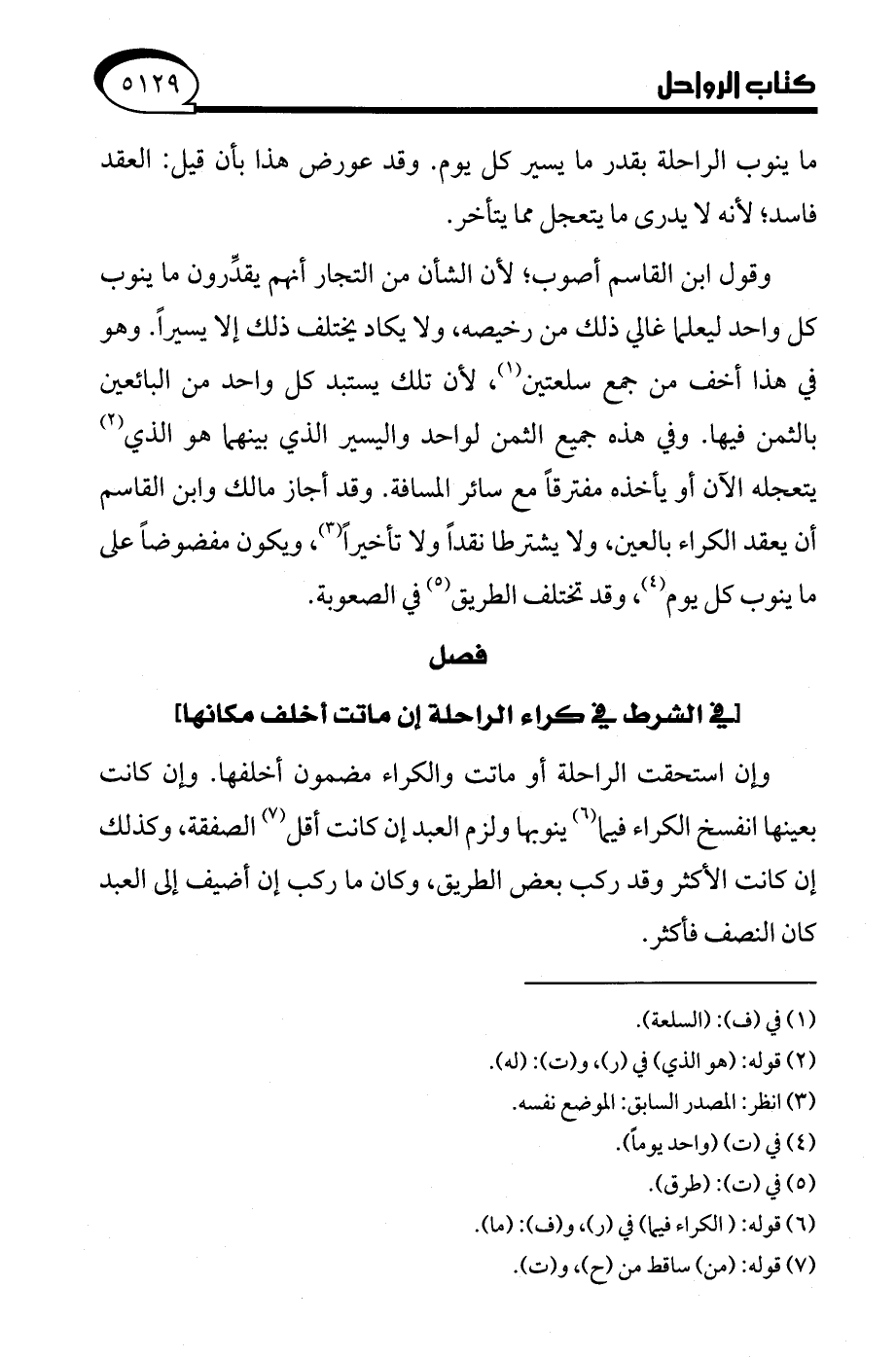 وقول ابن القاسم أصوب؛ لأن الشأن من التجار أنهم يقدِّرون ما ينوب كل واحد ليعلما غالي ذلك من رخيصه، ولا يكاد يختلف ذلك إلا يسيرًا. وهو في هذا أخف من جمع سلعتين (¬1)؛ لأن تلك يستبد كل واحد من البائعين بالثمن فيها. وفي هذه جميع الثمن لواحد واليسير الذي بينهما هو الذي (¬2) يتعجله الآن أو يأخذه مفترقًا مع سائر المسافة. وقد أجاز مالك وابن القاسم أن يعقد الكراء بالعين، ولا يشترطا نقدًا ولا تأخيرًا (¬3)، ويكون مفضوضًا على ما ينوب كل يوم (¬4)، وقد تختلف الطريق (¬5) في الصعوبة.