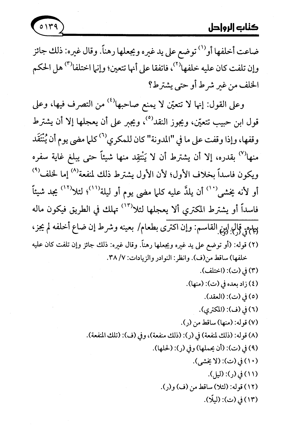 (¬2) قوله: (أو توضع على يد غيره ويجعلها رهنًا. وقال غيره: ذلك جائز وإن تلفت كان عليه خلفها) ساقط من (ف). وانظر: النوادر والزيادات: 7/ 38.