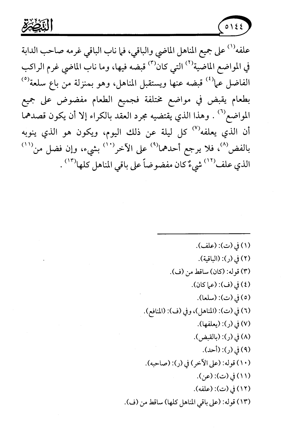 علفه (¬1) على جميع المناهل الماضي والباقي، فما ناب الباقي غرمه صاحب الدابة في المواضع الماضية (¬2) التي كان (¬3) قبضه فيها، وما ناب الماضي غرم الراكب الفاضل عما (¬4) قبضه عنها ويستقبل المناهل، وهو بمنزلة من باع سلعة (¬5) بطعام يقبض في مواضع مختلفة فجميع الطعام مفضوض على جميع المواضع (¬6). وهذا الذي يقتضيه مجرد العقد بالكراء إلا أن يكون قصدهما أن الذي يعلفه (¬7) كل ليلة عن ذلك اليوم، ويكون هو الذي ينوبه بالفض (¬8)، فلا يرجع أحدهما (¬9) على الآخر (¬10) بشيء، وإن فضل من (¬11) الذي علف (¬12) شيءٌ كان مفضوضًا على باقي المناهل كلها (¬13).