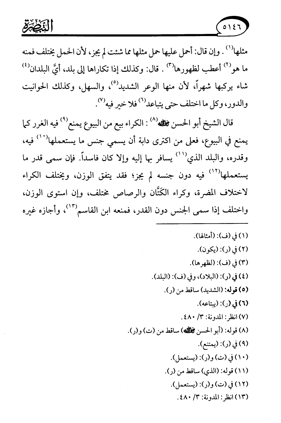 قال الشيخ أَبو الحسن - رضي الله عنه - (¬8): الكراء بيع من البيوع يمنع (¬9) فيه الغرر كما يمنع في البيوع، فعلى من اكترى دابة أن يسمي جنس ما يستعملها (¬10) فيه، وقدره، والبلد الذي (¬11) يسافر بها إليه وإلا كان فاسدًا. فإن سمى قدر ما يستعملها (¬12) فيه دون جنسه لم يجز، فقد يتفق الوزن، ويختلف الكراء لاختلاف المضرة، وكراء الكَتَّان والرصاص مختلف، وإن استوى الوزن، وإختلف إذا سمى الجنس دون القدر، فمنعه ابن القاسم (¬13)، وأجازه غيره