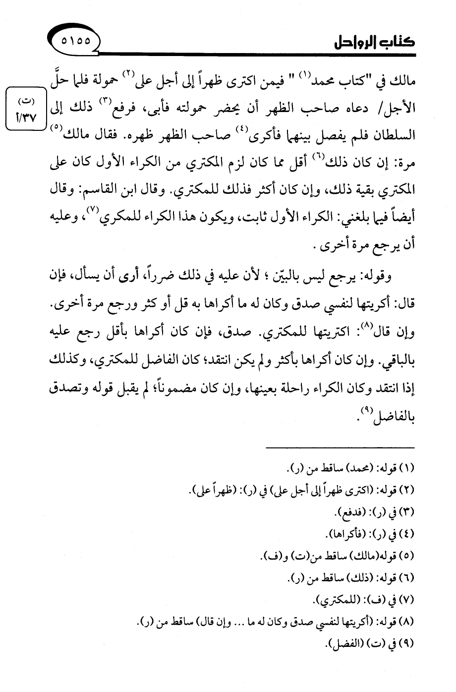 وقوله: يرجع ليس بالبيّن؛ لأنَّ عليه في ذلك ضررًا، أرى أن يسأل، فإن قال: أكريتها لنفسي صدق وكان له ما أكراها به قل أو كثر ورجع مرة أخرى. وإن قال (¬8): اكتريتها للمكتري. صدق، فإن كان أكراها بأقل رجع عليه بالباقي. وإن كان أكراها بأكثر ولم يكن انتقد، كان الفاضل للمكتري، وكذلك إذا انتقد وكان الكراء راحلة بعينها، وإن كان مضمونًا، لم يقبل قوله وتصدق بالفاضل (¬9).
