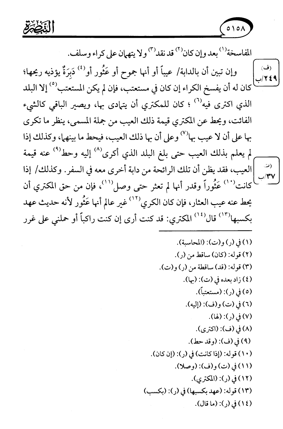 وإن تبين أن بالدابة عيبًا أو أنها جموح أو عَثُور أو (¬4) دَبِرَةٌ يؤذيه ريحها، كان له أن يفسخ الكراء إن كان في مستعتب، فإن لم يكن المستعتب (¬5) إلا البلد الذي اكترى فيه (¬6)، كان للمكتري أن يتمادى بها، ويصير الباقي كالشيء الفائت، ويحط عن المكتري قيمة ذلك العيب من جملة المسمى، ينظر ما تكرى بها على أن لا عيب بها (¬7) وعلى أن بها ذلك العيب، فيحط ما بينهما، وكذلك إذا لم يعلم بذلك العيب حتى بلع البلد الذي أكرى (¬8) إليه وحط (¬9) عنه قيمة العيب، فقد يظن أن تلك الرائحة من دابة أخرى معه في السفر. وكذلك إذا كانت (¬10) عَثُورًا وقدر أنها لم تعثر حتى وصل (¬11)، فإن من حق المكتري أن يحط عنه عيب العثار، فإن كان الكري (¬12) غير عالم أنها عَثُور لأنه حديث عهد بكسبها (¬13) قال (¬14) المكتري: قد كنت أرى إن كنت راكبًا أو حملني على غرر