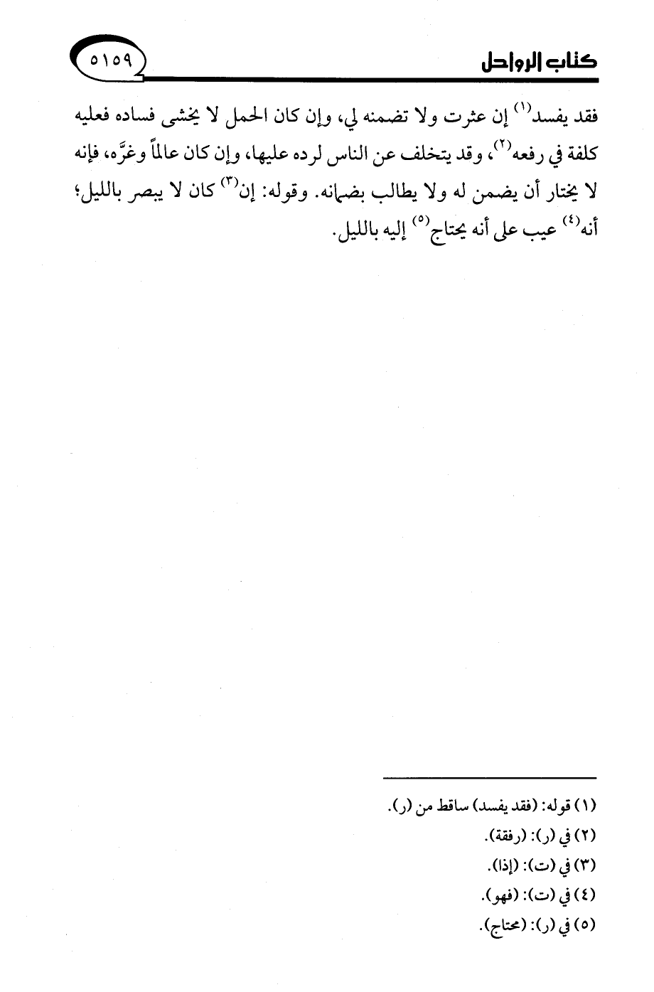 فقد يفسد (¬1) إن عثرت ولا تضمنه لي، وإن كان الحمل لا يخشى فساده فعليه كلفة في رفعه (¬2)، وقد يتخلف عن الناس لرده عليها، وإن كان عالمًا وغرَّه، فإنَّه لا يختار أن يضمن له ولا يطالب بضمانه. وقوله: إن (¬3) كان لا يبصر بالليل، أنه (¬4) عيب على أنه يحتاج (¬5) إليه بالليل.